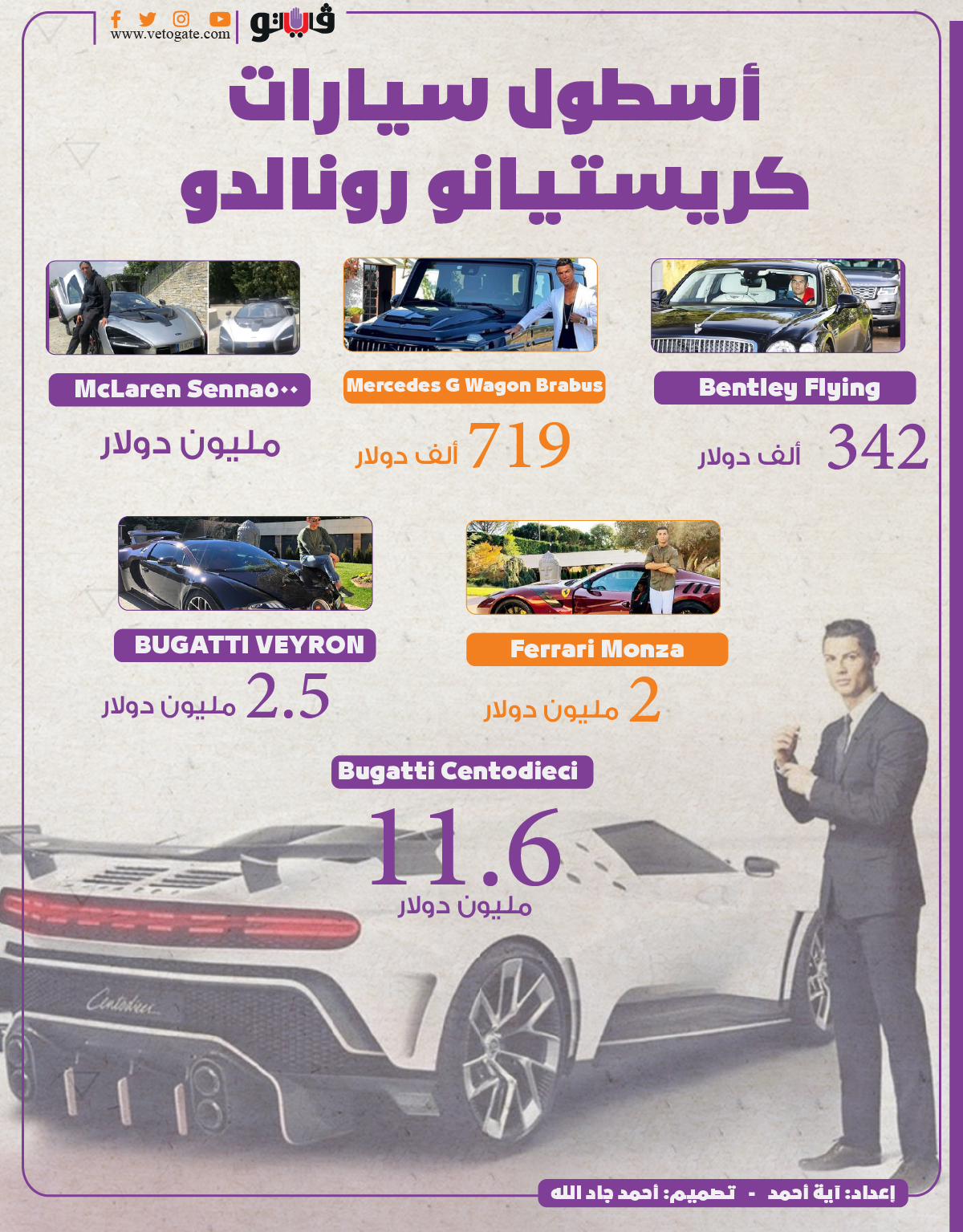 أسطول سيارات كريستيانو رونالدو| إنفوجراف الأربعاء 29/سبتمبر/2021 - 01:21 م 9/29/2021 1:21:58 PM رونالدو آية أحمد شارك طباعة 18 حجم الخط شارك طباعة كريستيانو رونالدو مانشستر يونايتد سيارات نجم مانشستر سيارة بوجاتي سيارة فيراري مونزا