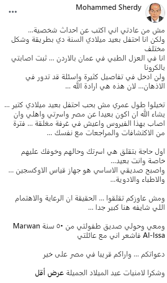وكتب محمد شردي، عبر حسابه الشخصي على موقع التواصل الاجتماعي فيس بوك: “مش من عادتي إني أكتب عن أحداث شخصية، ولكن أنا أحتفل بعيد ميلادي السنة دي بطريقة وشكل مختلف، أنا في العزل الطبي في عمان بالأردن، ثبتت إصابتي بكورونا، ولن أدخل في تفاصيل كثيرة وأسئلة قد تدور في الأذهان، لأن هذه هي إرادة الله”.