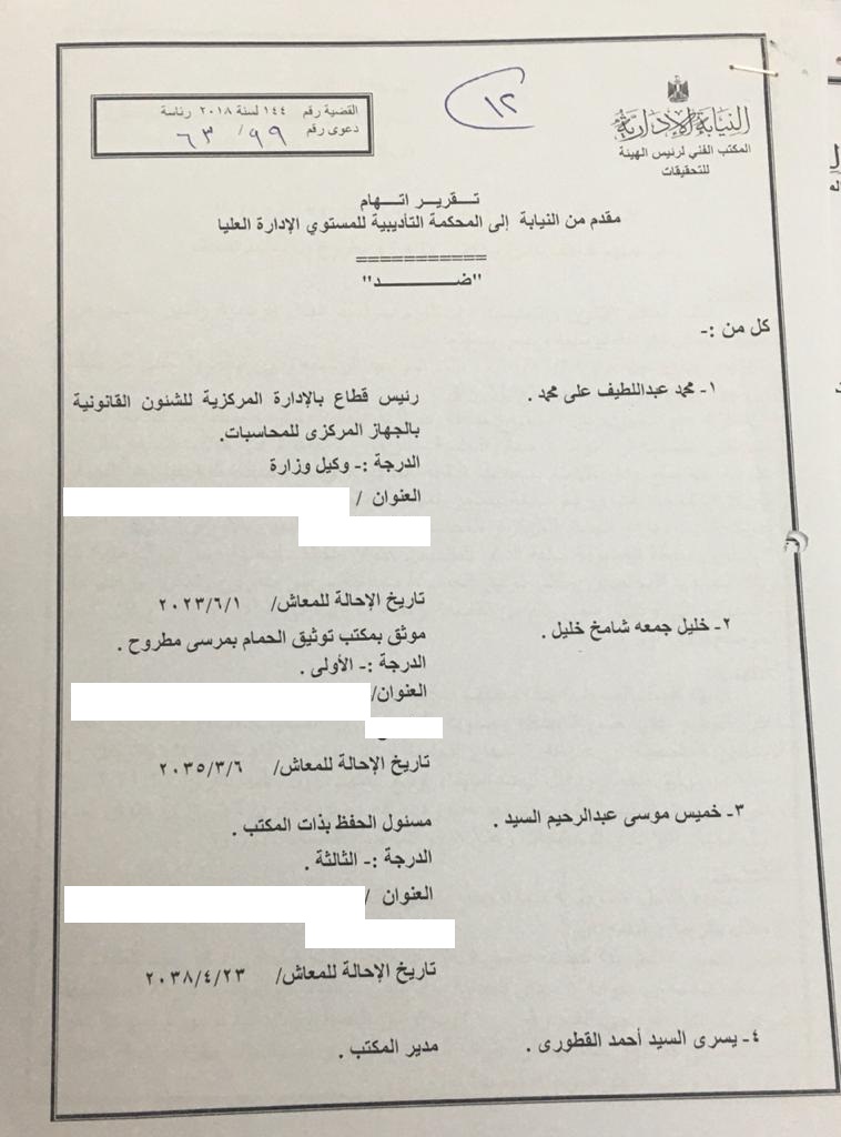 قررت النيابة الإدارية في القضية رقم 99 لسنة 63 قضائية عليا إحالة رئيس قطاع بالإدارة المركزية للشئون القانونية بالجهاز المركزي للمحاسبات ومدير مكتب توثيق الحمام بمرسى مطروح وآخرين من مساعديه للمحاكمة التأديبية العاجلة بعد ثبوت إرتكابهم جرائم تزوير وأختلاس مستندات رسمية.
