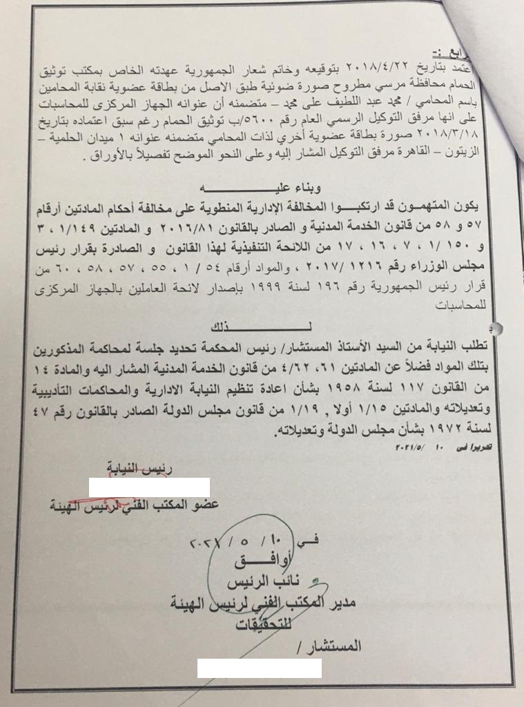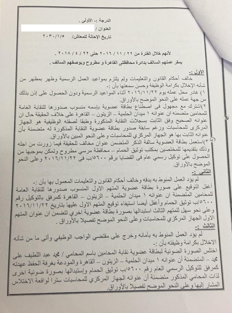 وجاء بالتحقيقات أن خليل جمعة شامخ، موثق بمكتب توثيق الحمام بمرسى مطروح لم يؤد العمل المنوط به بدقة وخالف أحكام القانون والتعليمات المعمول بها بأن أغفل التوقيع على صورة بطاقة عضوية المتهم الأول المنسوب صدورها للنقابة العامة للمحامين، وأغفل ايضًا استيفاء توقيع المتهم الأول عليها مما سهل له استبدالها بصورة بطاقة عضوية اخرى تتضمن أن عنوانه الأول هو الجهاز المركزي للمحاسبات