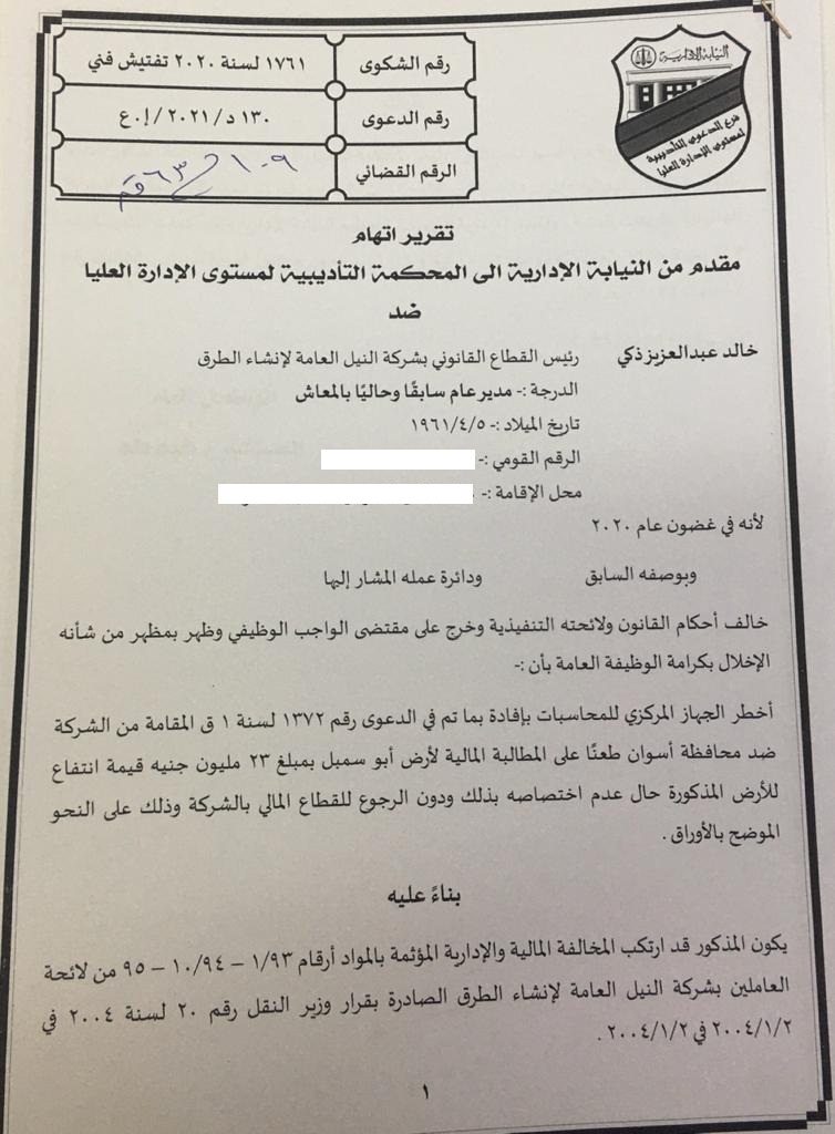 وتبين من أوراق القضية أن المحال أخطر الجهاز المركزي للمحاسبات بإفادة بما تم في الدعوى رقم 1372 لسنة 1 قضائية المقامة من الشركة ضد محافظة أسوان طعنًا على المطالبة المالية لأرض أبو سمبل بمبلغ 23 مليون جنيه قيمة انتفاع للأرض رغم عدم اختصاصه بذلك ودون الرجوع للقطاع المالي بالشركة مرتكبًا المخالفة المالية والإدارية المؤثمة بالمواد أرقام 93/1 و94/10ــ 95 من لائحة العاملين بشركة النيل العامة لإنشاء الطرق الصادرة بقرار وزير النقل رقم 20 لسنة 2004.