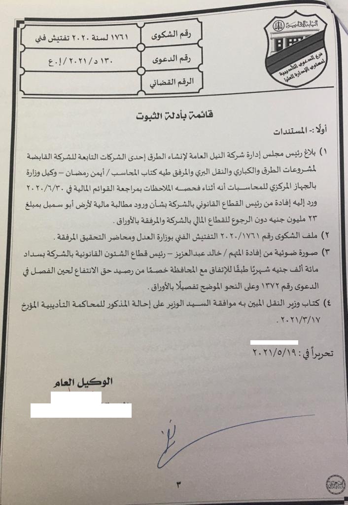 وتضمنت قائمة أدلة الثبوت بلاغ رئيس مجلس إدارة شركة النيل العامة لإنشاء الطرق مرفق به مذكرة المحاسب أيمن رمضان، وكيل وزارة بالجهاز المركزي للمحاسبات تتضمن أنه أثناء فحصه الملاحظات بمراجعة القوائم المالية في 30 يونيو 2020، ورد اليه إفادة من القطاع القانوني بالشركة بشأن ورود مطالبة مالية لأرض أبو سمبل بمبلغ 23 مليون جنيه دون الرجوع للقطاع المالي بالشركة، وصورة ضوئية من إفادة المتهم خالد عبد العزيز، رئيس القطاع القانوني بشركة النيل العامة لإنشاء الطرق بسداد 100 ألف جنيه شهريًا طبقًا للاتفاق المبرم مع المحافظة خصمًا من رصيد حق الإنتفاع لحين الفصل في الدعوى رقم 1372، وخطاب وزير النقل بالموافقة على الإحالة للمحاكمة.