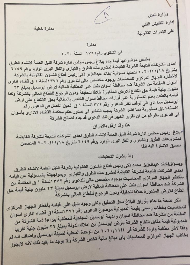 رصد تقرير قضائي صادر عن إدارة التفتيش على الإدارات القانونية بوزارة العدل أزمة طاحنة بين محافظ أسوان ورئيس شركة النيل العامة لإنشاء الطرق التابعة للشركة القابضة لمشروعات الطرق والكباري والنقل البري حول سداد 23 مليون جنيه قيمة أرض أبو سمبل أحيل على إثرها رئيس القطاع القانوني بالشركة بعد ثبوت ارتكابه مخالفات مالية وإدارية وقانونية جسيمة.