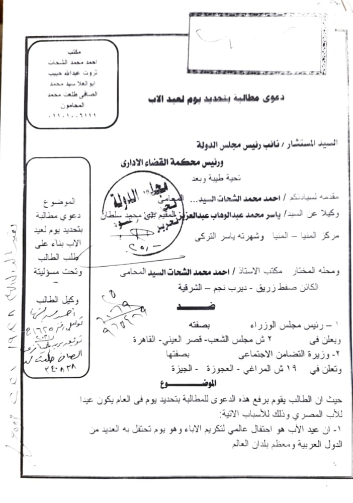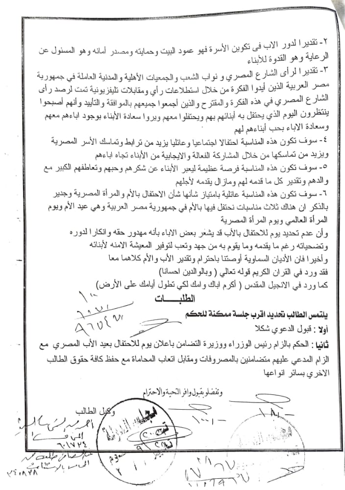 وقال ياسر التركي في دعواه التي حملت رقم 72385 لسنة 75 ق، إن عيد الأب هو يوم عالمي يحتفل فيه معظم الدول بهذه المناسبة إلا أنه لا يوجد في مصر أي اهتمام بهذا اليوم على الرغم من أهميته على المستوى الاجتماعي للأسرة.