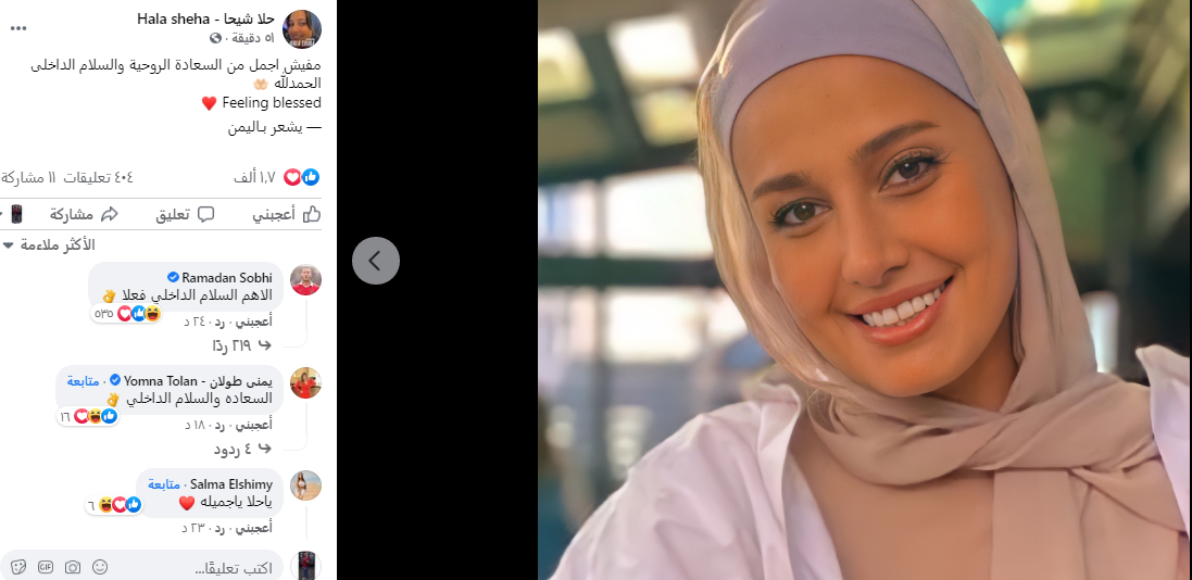 فى هذا السياق، نشرت “حلا”، صورته بالحجاب، على إحدى صفحاتها التي أنشأتها مؤخرًا على “فيس بوك”، معلقة بقولها: “مفيش أجمل من السعادة الروحية والسلام الداخلي، الحمد لله”، وعقب هذا المنشور علق “رمضان” من خلال التعليقات على الصورة بقوله:"الأهم السلام الداخلي فعلا".