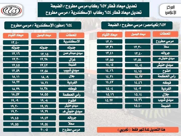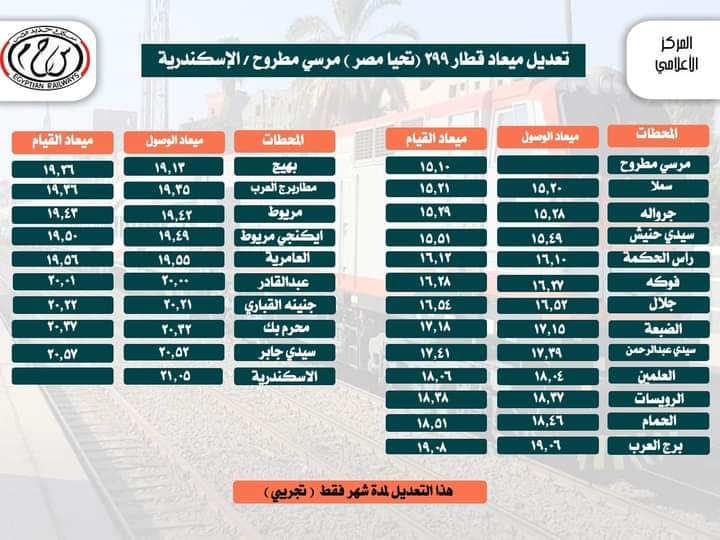 أولا: تعديل مواعيد قطارات 299 و657 و 654 على خط مرسى مطروح / الإسكندرية والعكس