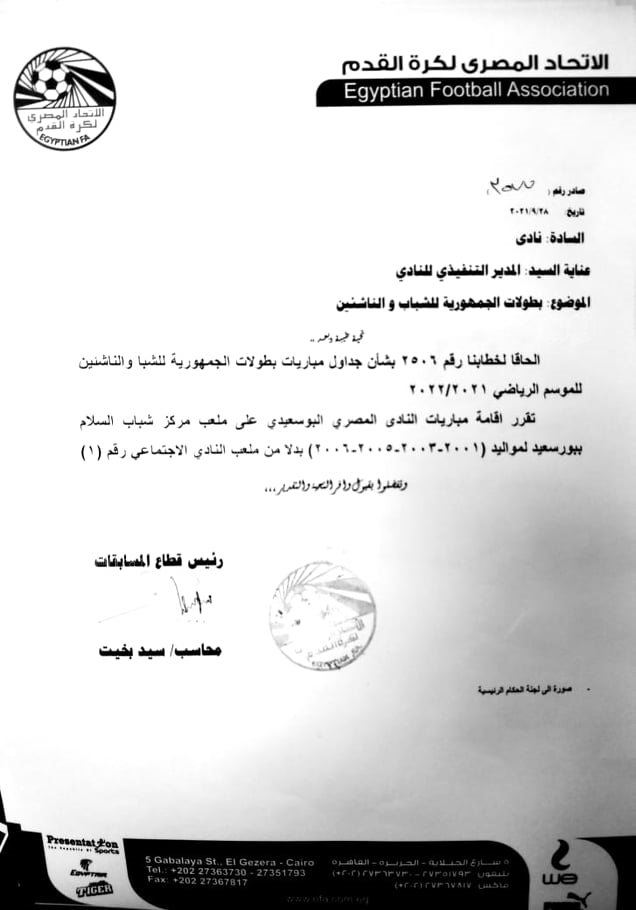 وتقرر إقامة مباريات النادي المصري علي ملعب مركز السلام ببورسعيد بدلا من ملعب النادي الاجتماعي لمواليد 2001 و2003 و2005 و2006.