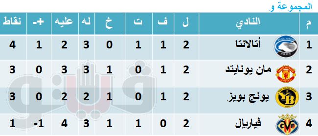 تنشر فيتو جدول ترتيب المجموعة السادسة لمسابقة دوري أبطال أوروبا والتي تضم أندية مانشستر يونايتد الإنجليزي وفياريال الاسباني وأتالانتا الايطالي ويونج بويز السويسري بعد نهاية الجولة الثانية.