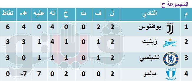 تنشر فيتو جدول ترتيب المجموعة الثامنة لدوري أبطال أوروبا والتي تضم يوفنتوس وتشيلسي ومالمو وزينيت بعد انتهاء الجولة الثانية.