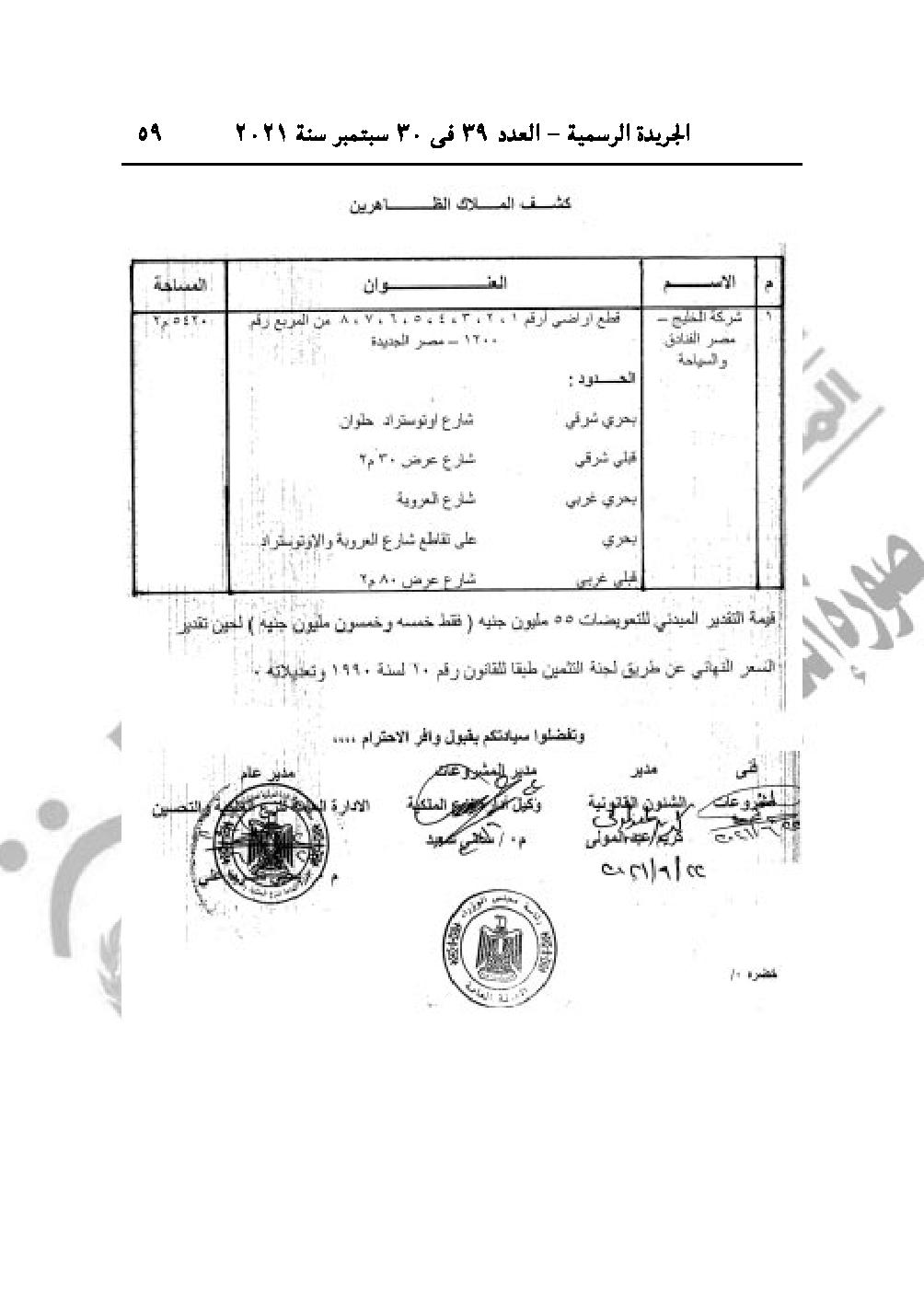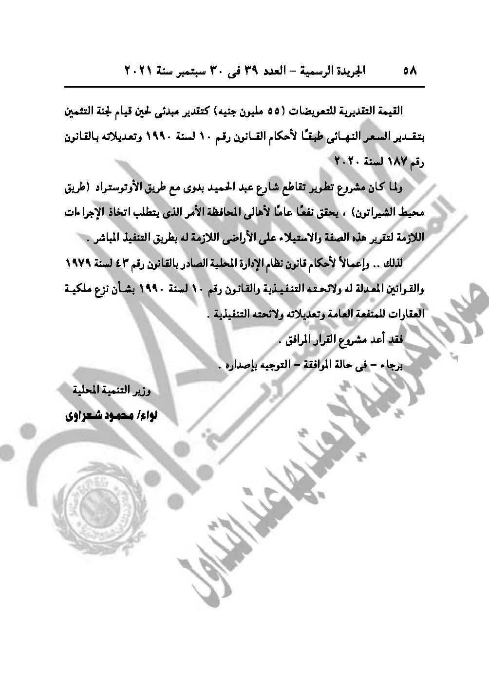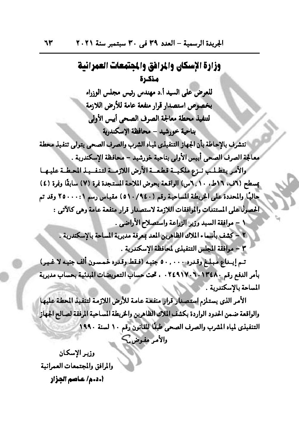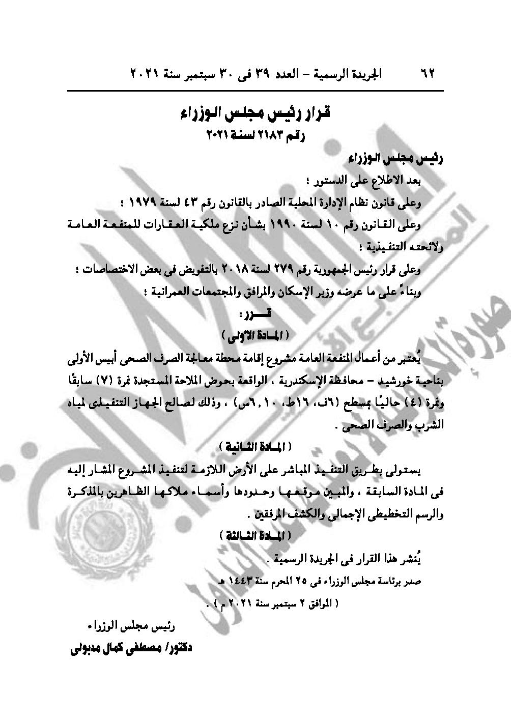 والقرار رقم 2183 لسنة 2021، باعتبار مشروع إقامة محطة معالجة الصرف الصحي أبيس الأولى بناحية خورشيد، محافظة الإسكندرية، من أعمال المنفعة العامة.