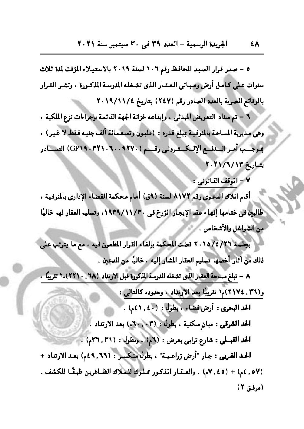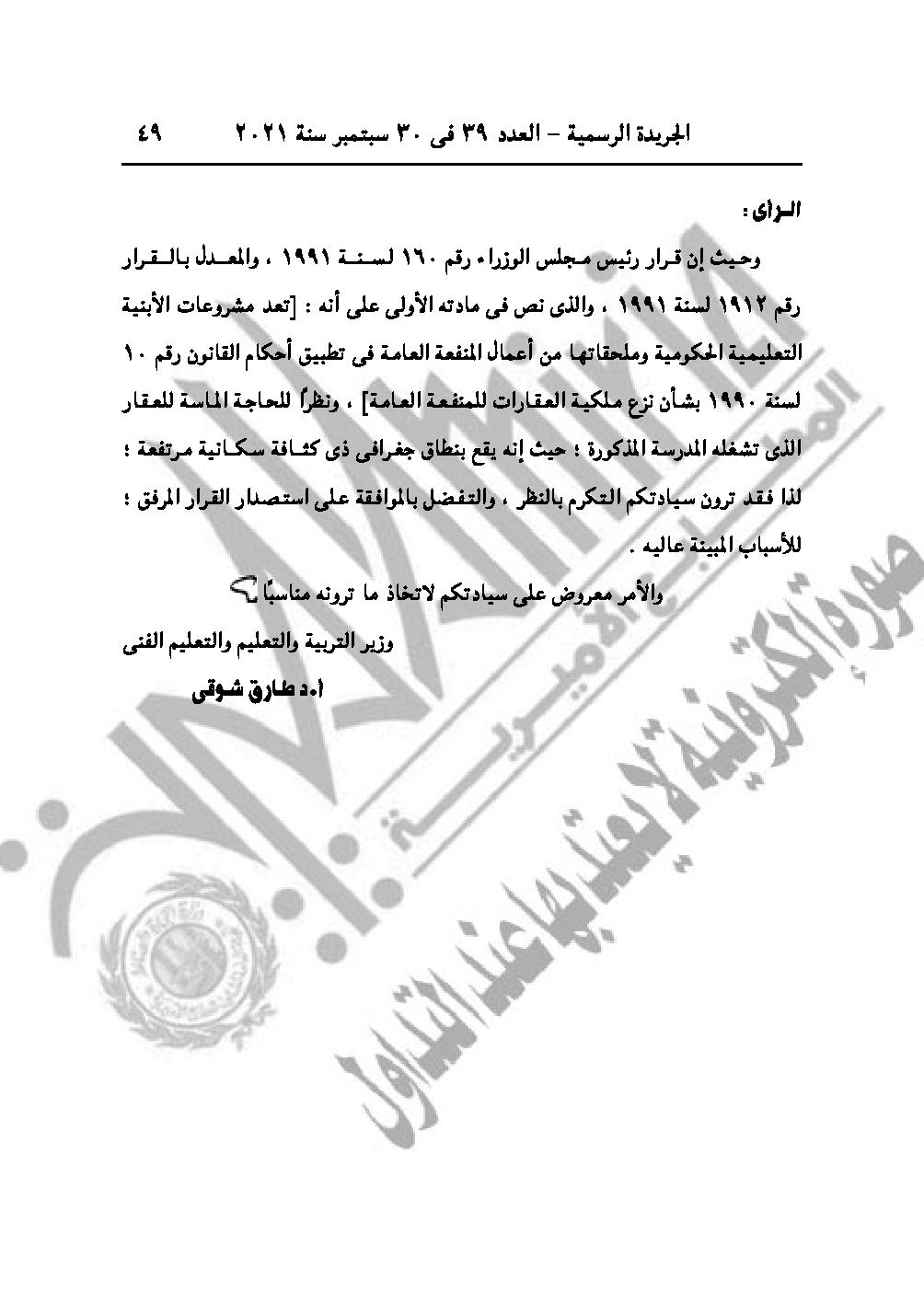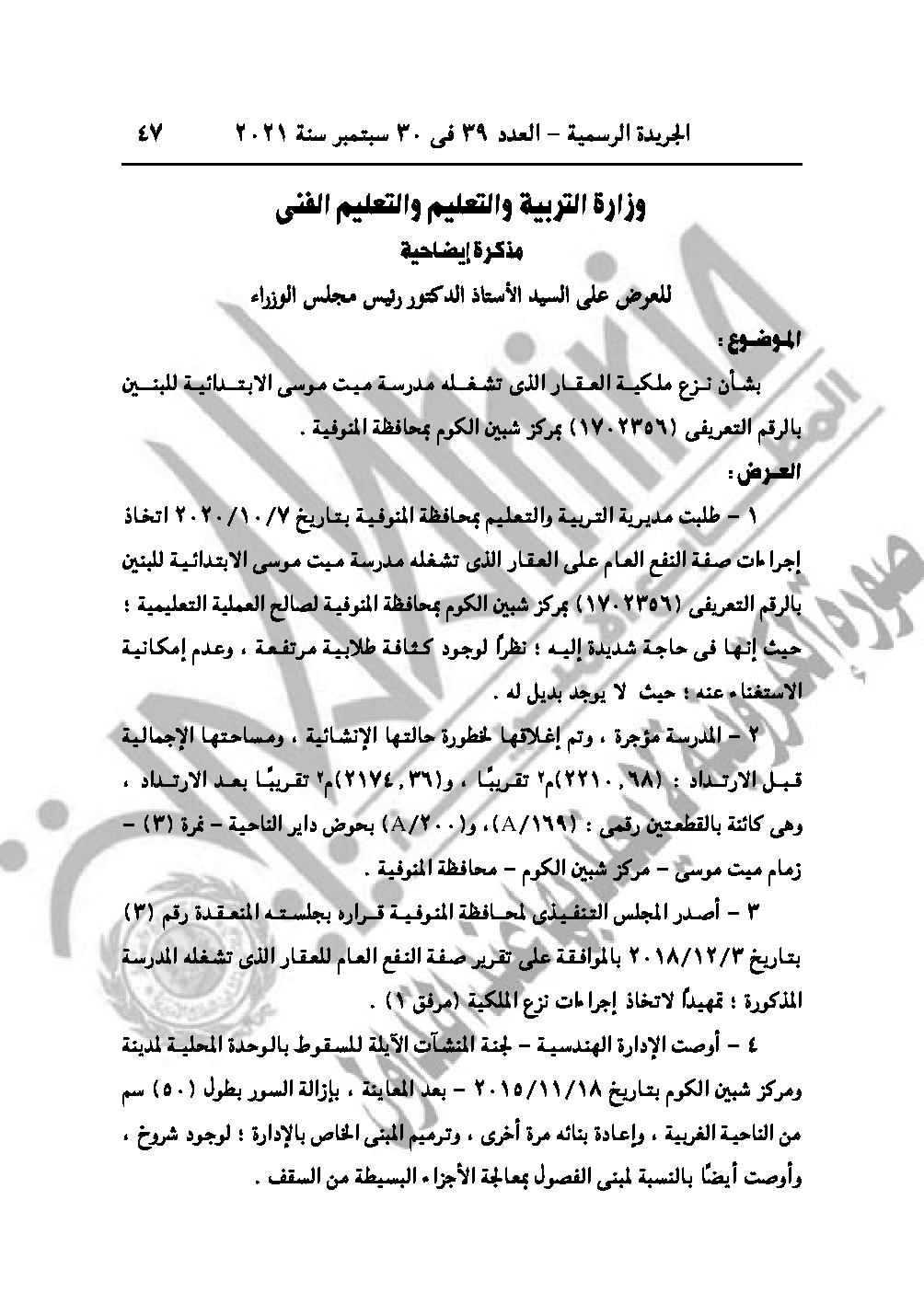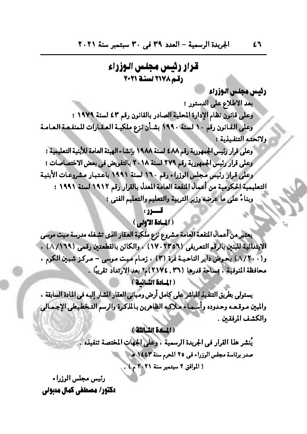 القرار رقم 2178 لسنة 2021، بشأن اعتبار مشروع نزع ملكية العقار الذي تشغله مدرسة ميت موسى الابتدائية للبنين، زمام ميت موسى مركز شبين الكوم محافظة المنوفية، من أعمال المنفعة العامة.