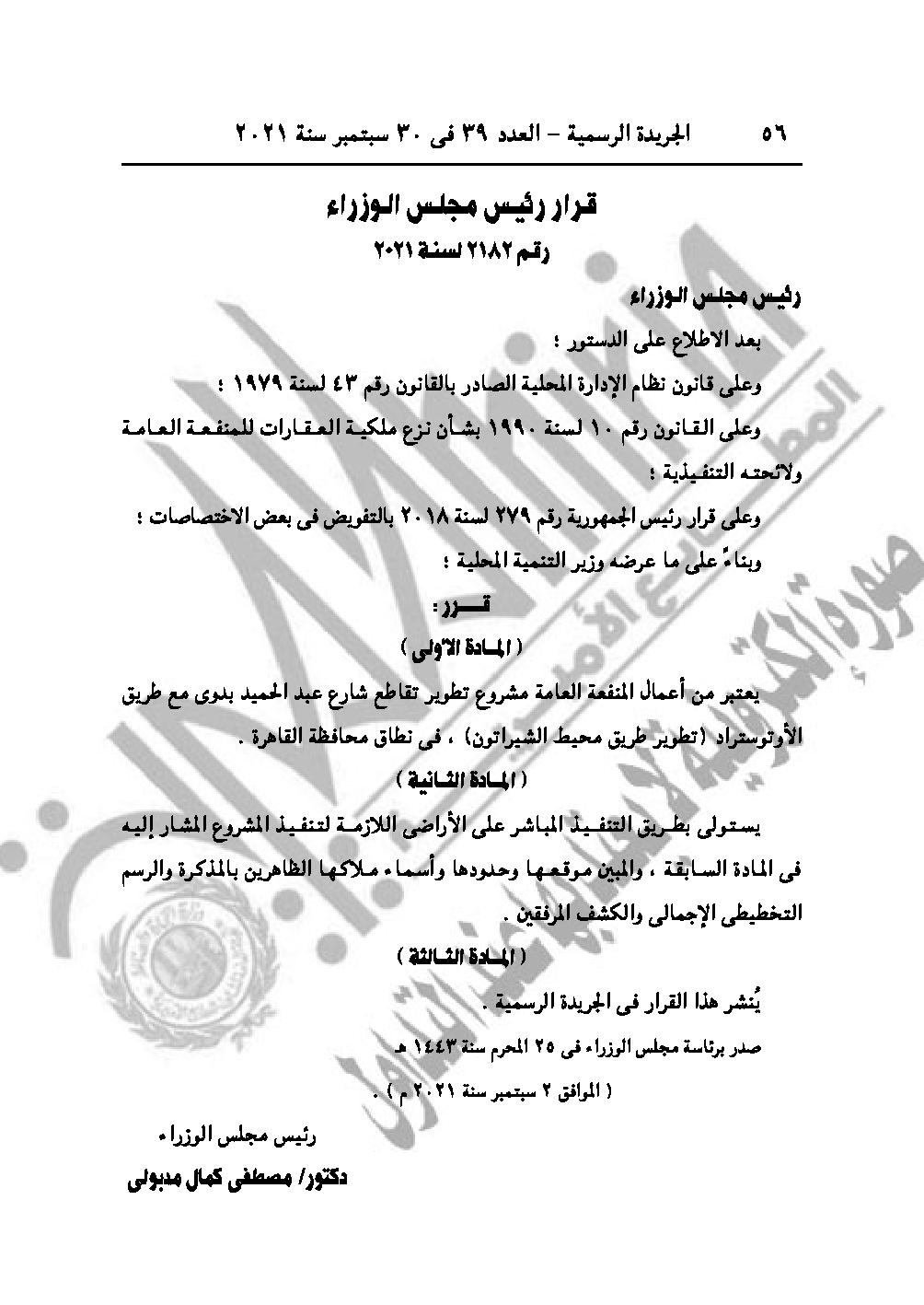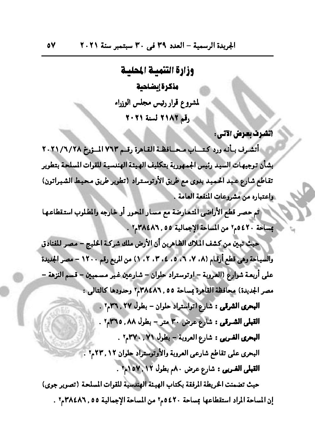 والقرار رقم 2182 لسنة 2021، باعتبار مشروع تطوير تقاطع شارع عبد الحميد بدوي مع طريق الأوتستراد (تطوير طريق محيط الشيراتون)، في نطاق محافظة القاهرة من أعمال المنفعة العامة.
