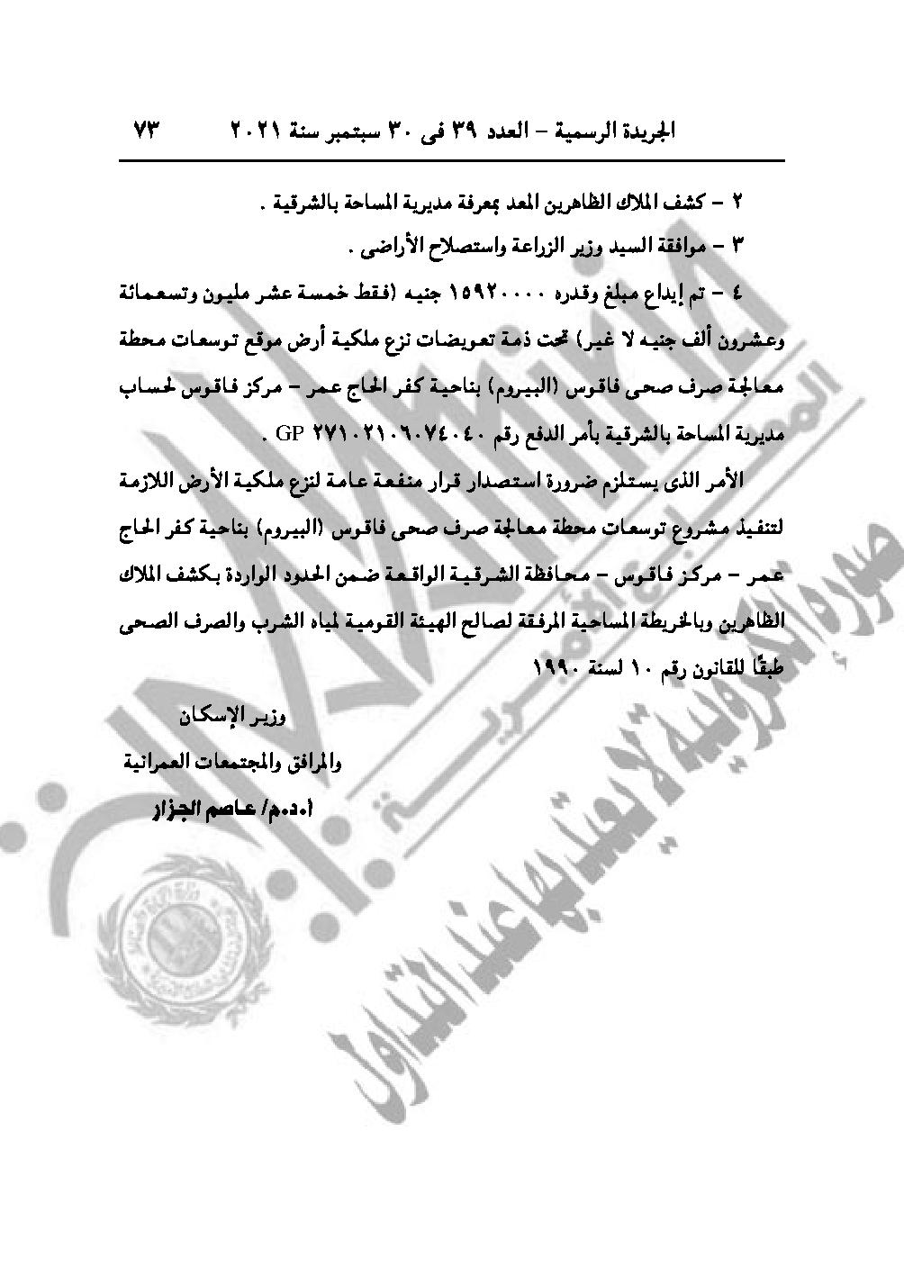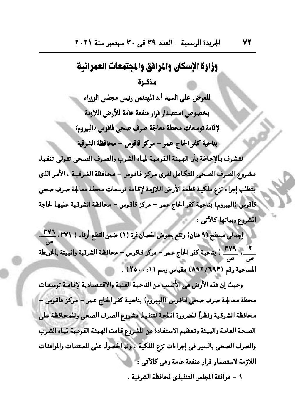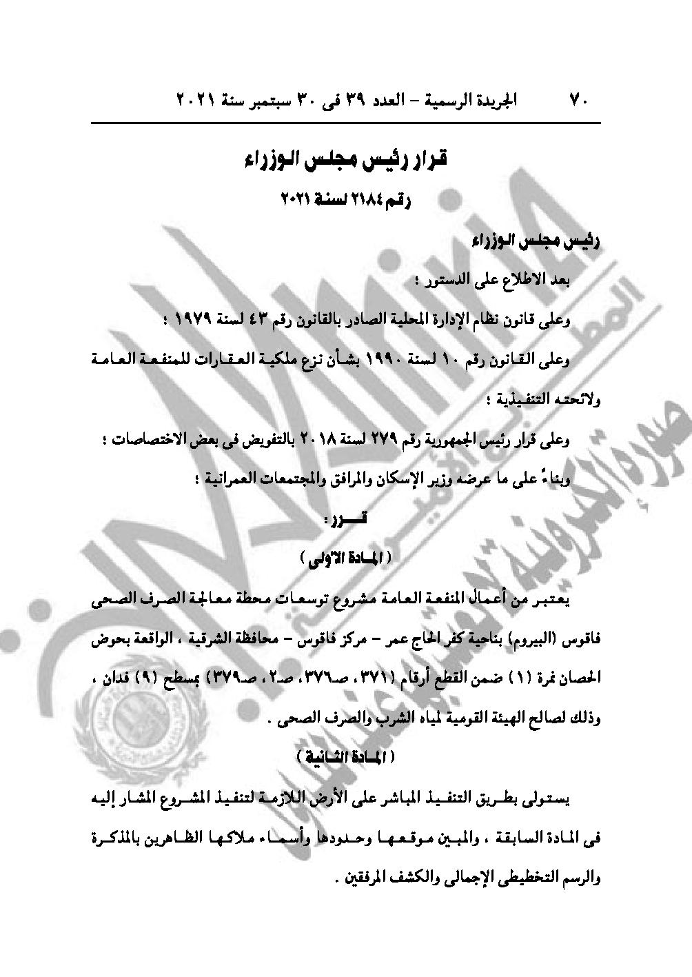 والقرار رقم 2184 لسنة 2021، باعتبار مشروع توسعات محطة معالجة الصرف الصحى فاقوس (البيروم) بناحية كفر الحاج عمر مركز فاقوس محافظة الشرقية، من أعمال المنفعة العامة.