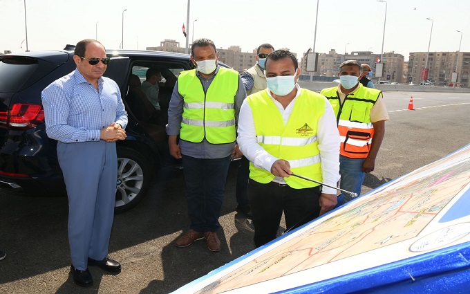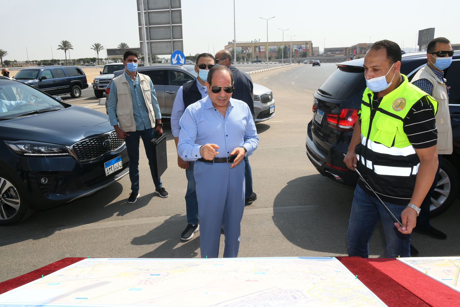 كما تفقد الرئيس كذلك سير الموقف التنفيذي بتوسعة ورفع كفاءة الطريق الدائري المحيط بالقاهرة الكبرى خاصة القطاع الممتد من محور الاوتوستراد بشرق القاهرة الي منطقة المنيب ليصبح ٨ حارات مرورية لكل اتجاه بدلا من ٤ حارات مع تزويده بكافة الخدمات الضرورية، وقد توقف الرئيس أثناء الجولة التفقدية ليناقش المسئولين بمواقع العمل بشأن تفاصيل الخطوات الإنشائية وتوقيتات التنفيذ.