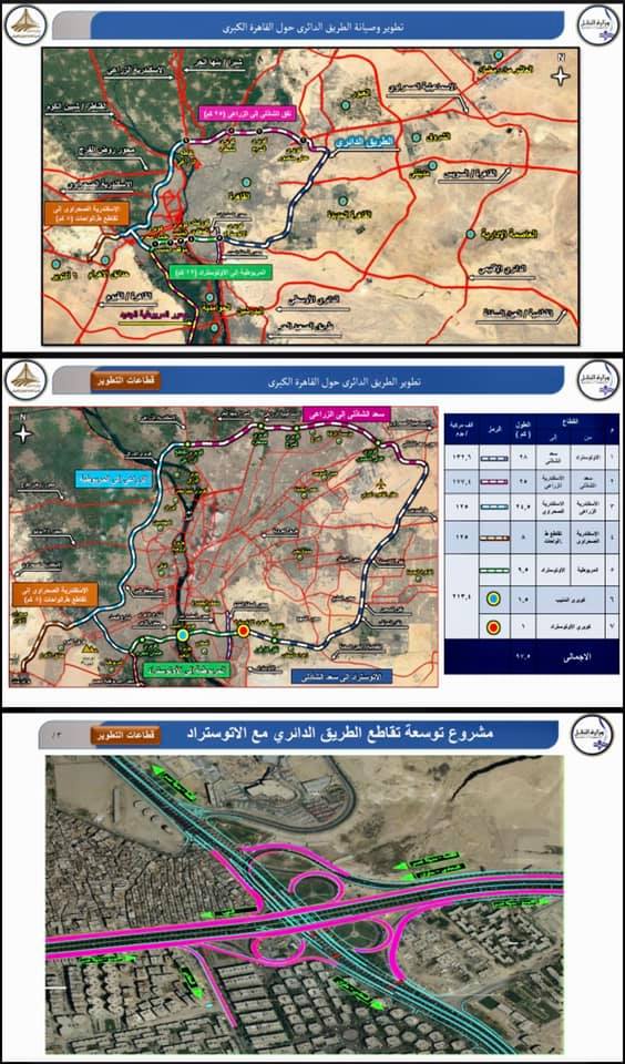 كما تفقد الرئيس كذلك سير الموقف التنفيذي بتوسعة ورفع كفاءة الطريق الدائري المحيط بالقاهرة الكبرى خاصة القطاع الممتد من محور الاوتوستراد بشرق القاهرة الي منطقة المنيب ليصبح ٨ حارات مرورية لكل اتجاه بدلا من ٤ حارات مع تزويده بكافة الخدمات الضرورية، وقد توقف الرئيس أثناء الجولة التفقدية ليناقش المسئولين بمواقع العمل بشأن تفاصيل الخطوات الانشائية وتوقيتات التنفيذ.