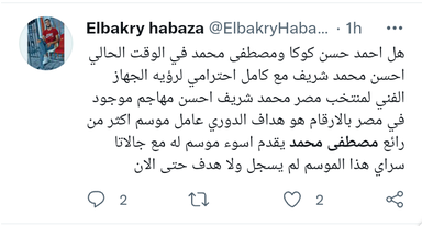 وأضاف آخر" هل احمد حسن كوكا ومصطفى محمد في الوقت الحالي احسن محمد شريف مع كامل احترامي لرؤية الجهاز الفني لمنتخب مصر محمد شريف احسن مهاجم موجود في مصر بالأرقام هو هداف الدوري عامل موسم اكثر من رائع مصطفى محمد يقدم اسوأ موسم له مع جالاتا سراي هذا الموسم لم يسجل ولا هدف حتى الآن".