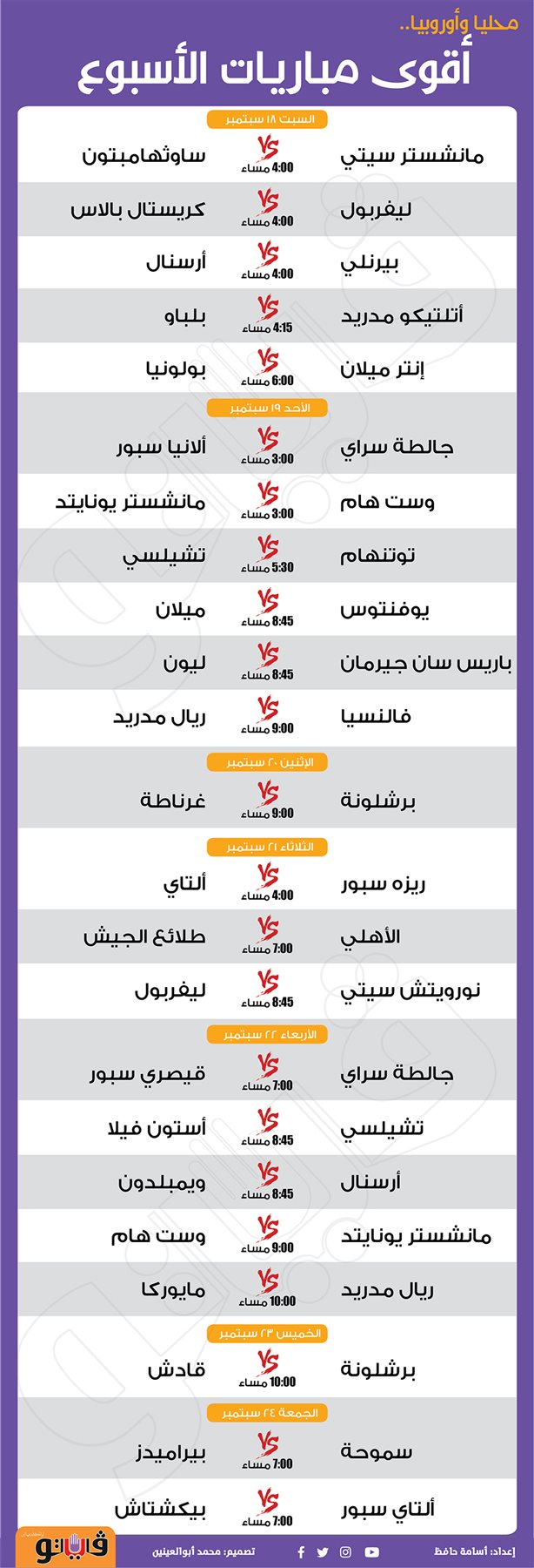 مباريات الأسبوع.. عالميا ومحليا | انفوجراف السبت 02/أكتوبر/2021 - 12:10 م 10/2/2021 12:10:58 PM محمد صلاح صفاء كامل شارك طباعة 18 حجم الخط شارك طباعة مانشستر يونايتد إيفرتون برايتون وبرشلونة ليفربول إسبانيول مصر أنجولا