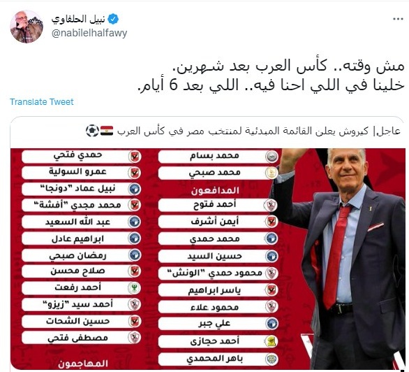 وكتب نبيل الحلفاوي في رسالته لمدير المنتخب كيروش عبر تويتر قائلًا:"مش وقته.. كأس العرب بعد شهرين. خلينا في اللي احنا فيه.. اللي بعد 6 أيام."