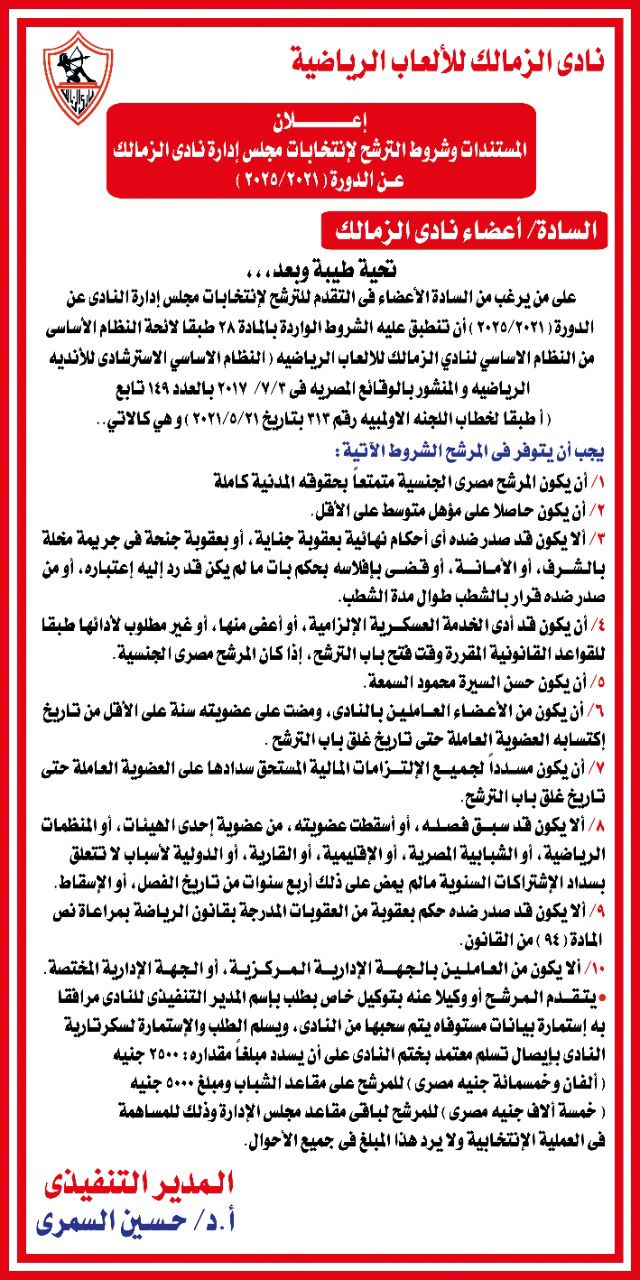 شروط الترشح لانتخابات مجلس إدارة نادي الزمالك عن الدورة 2021-2025