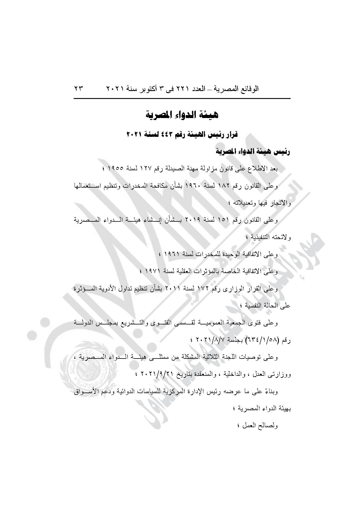 ويأتي ذلك في ضوء اختصاصات هيئة الدواء المصرية المقررة بالقانون رقم (١٥١) لسنة ٢٠١٩ وحلول الهيئة محل وزارة الصحة في اختصاصاتها المذكورة في قانون مزاولة مهنة الصيدلة رقم (١٢٧) لسنة ١٩٥٥، ومنها اختصاص الهيئة بتنظيم وتسجيل وتداول ورقابة المستحضرات والمستلزمات الطبية، والمواد الخام التي تدخل في تصنيعها أينما وردت في القوانين واللوائح والقرارات التنظيمية ذات الصلة، ولا سيما إدراج المواد على جداول المخدرات.