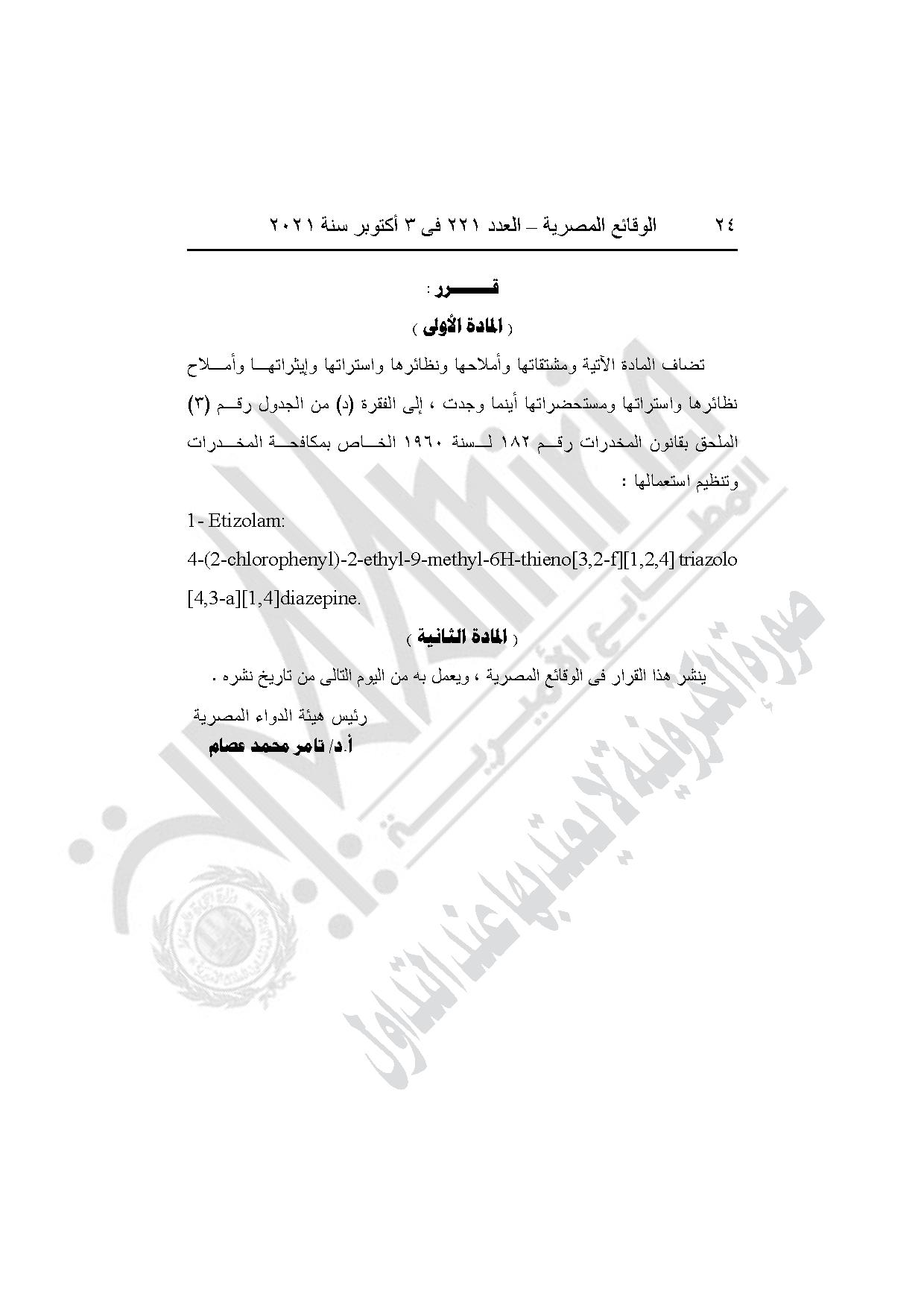 نشرت جريدة الوقائع المصرية في عددها رقم 221، الصادر في 3 أكتوبر 2021، قرار هيئة الدواء المصرية، رقم 443 لسنة 2021، بشأن إدراج Etizolam، ويستخدم لعلاج اضطراب القلق العام المترافق مع الاكتئاب واضطراب الهلع والأرق. في جدول المخدرات.