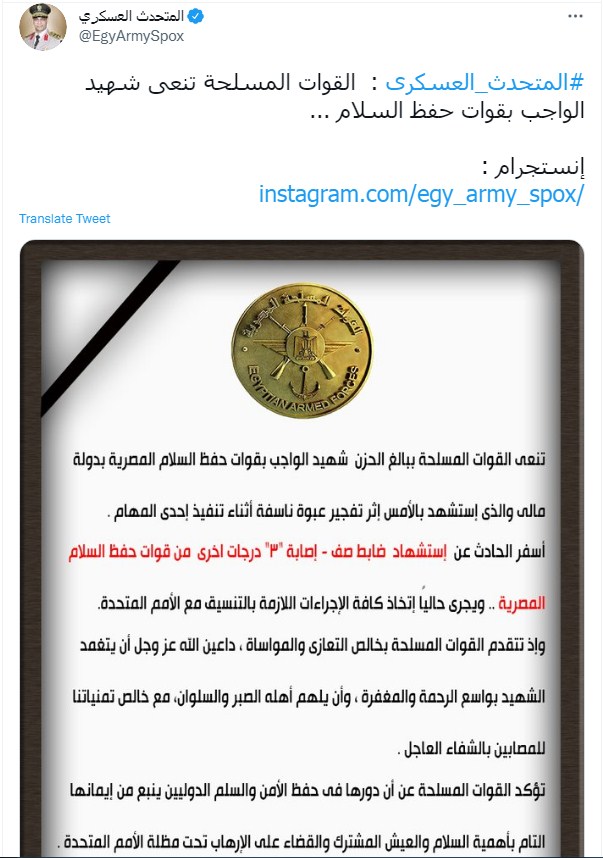 وذكر بيان القوات المسلحة: "أسفر الحادث عن استشهاد ضابط صف- إصابة "3" درجات أخرى من قوات حفظ السلام المصرية".