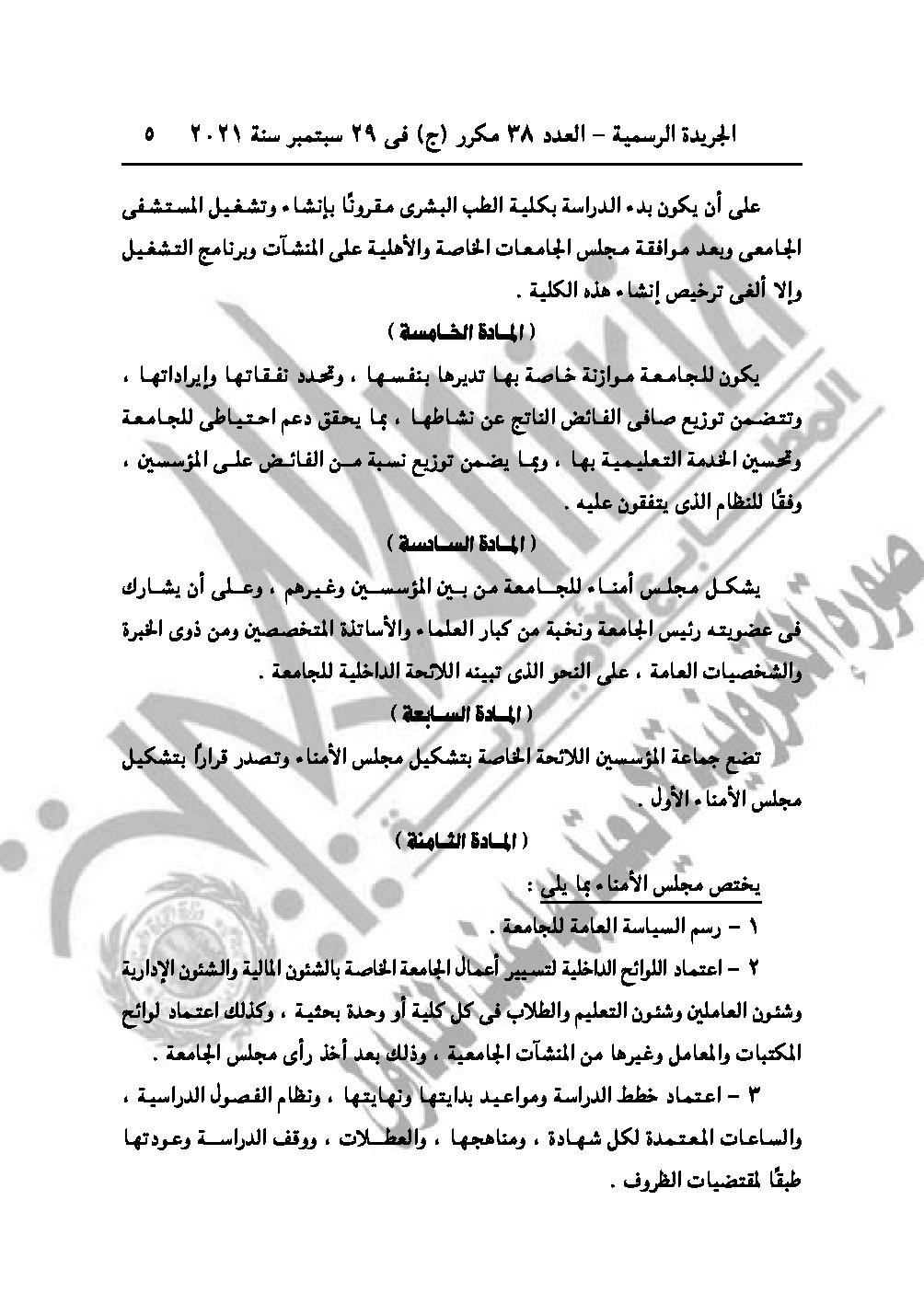ونصت المادة الثانية على ألا يجوز للجامعة البدء في ممارسة نشاطها في الكليات قبل استكمال مقوماتها البشرية والمادية وثبوت صلاحيتها لحسن أداء العملية التعليمية والبحث العلمي، وإبرام اتفاقيات تعاون مع جامعات دولية ذات سمعة مميزة.