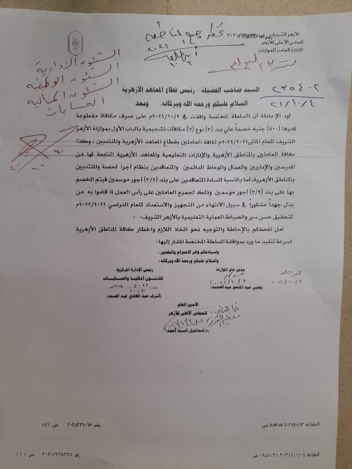 ونص قرار شيخ الأزهر - الذي حصلت فيتو على نسخة منه - على أن تصرف المكافأة للعاملين بالمناطق والإدارات التعليمية والمعاهد الأزهرية، الدائمين والمؤقتين والمتعاقدين بنظام الحصة.