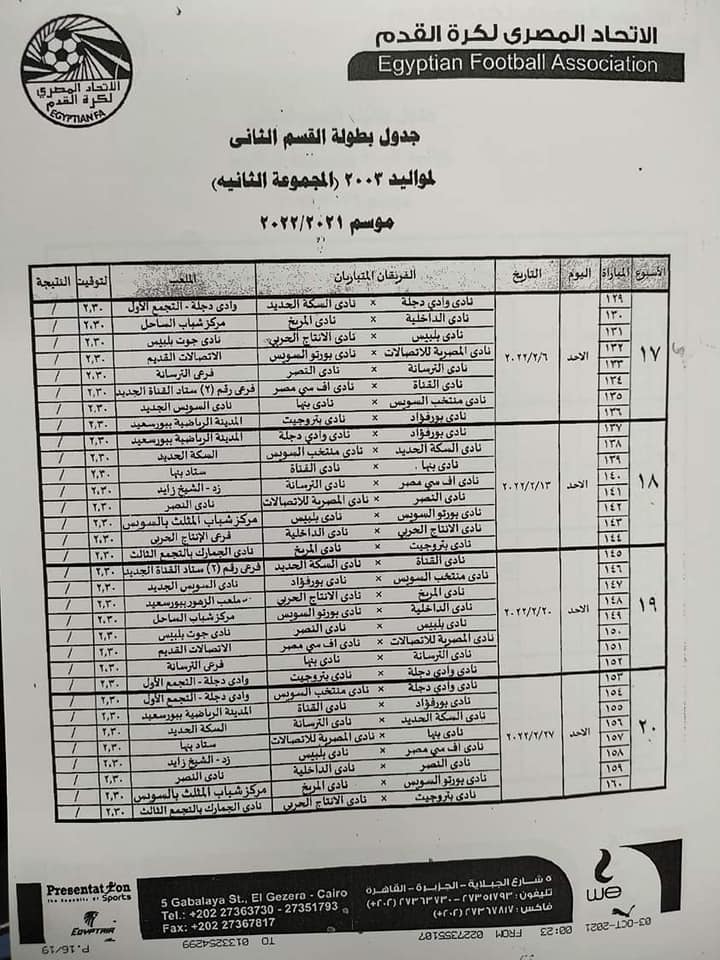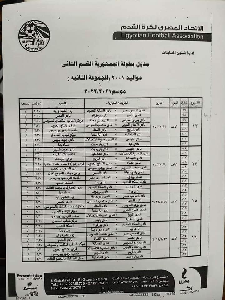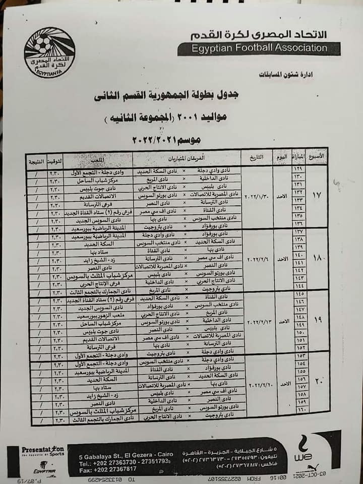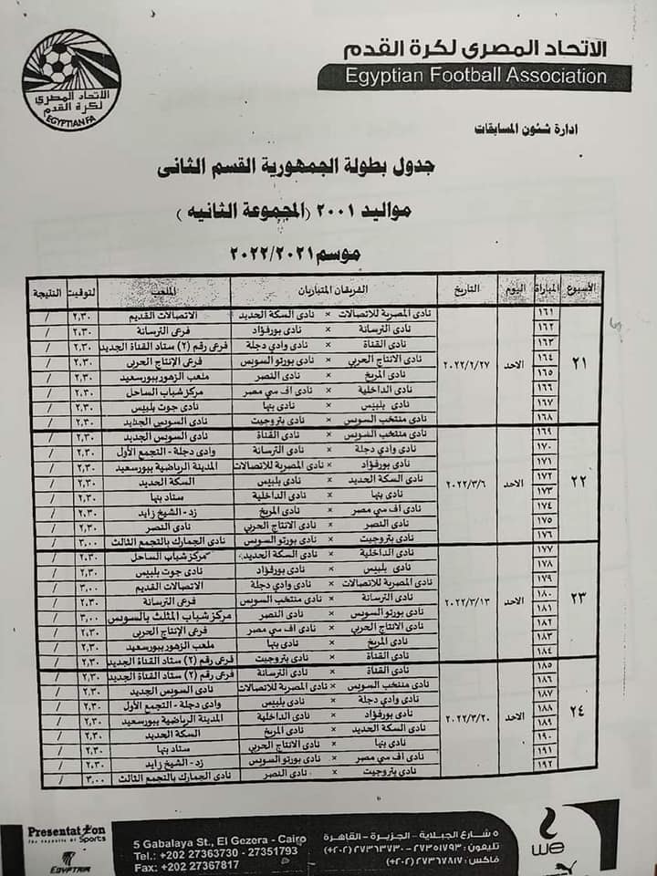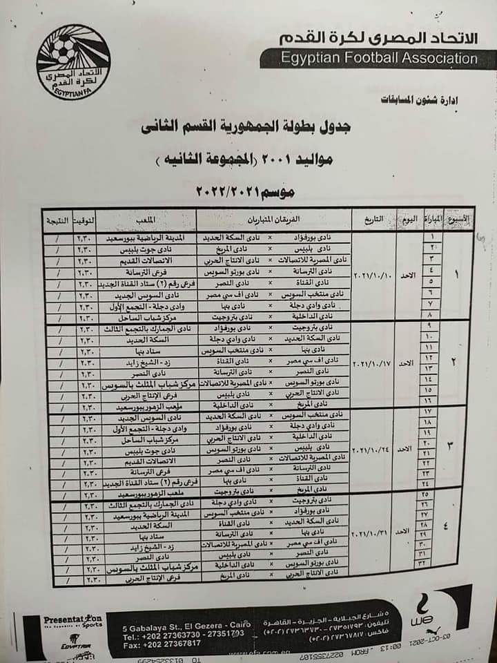 أعلن اتحاد الكرة، عن جدول مباريات دوري الجمهورية لأندية دوري القسم الثاني، المجموعة الثانية لفرق القاهرة والقناة، موسم 2021 -2022.