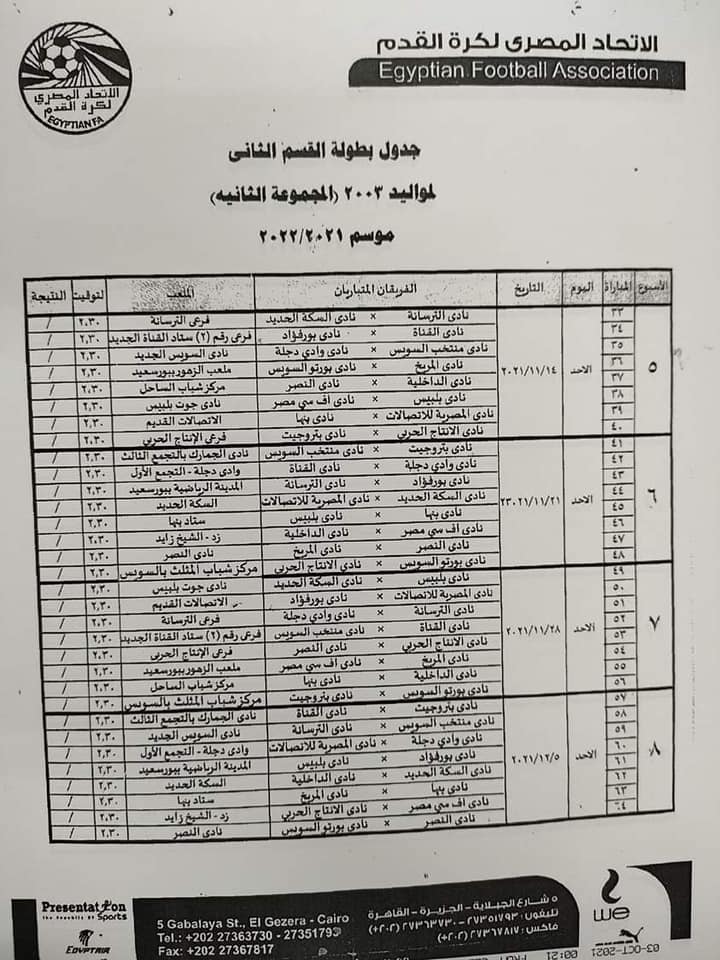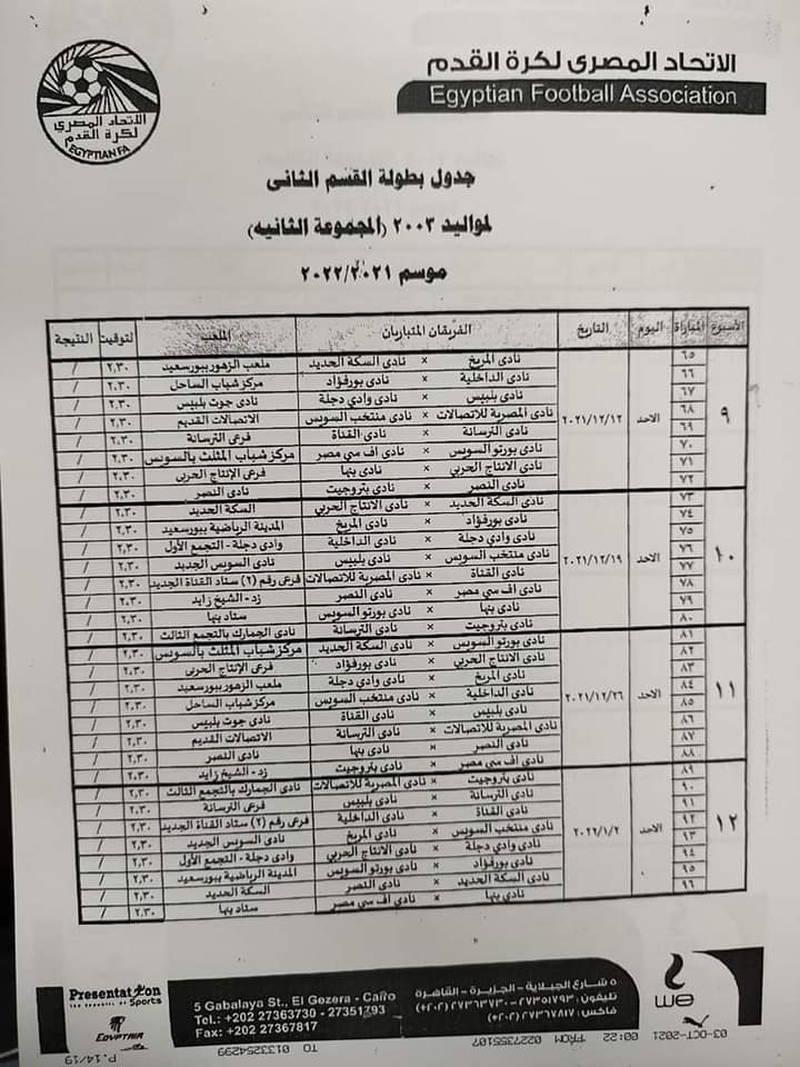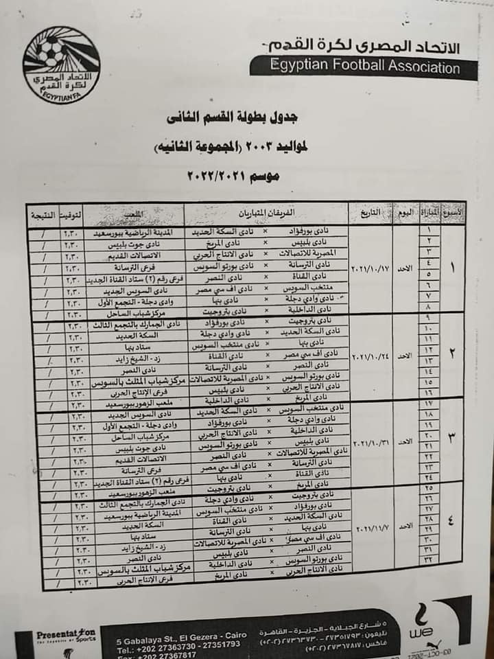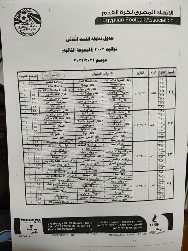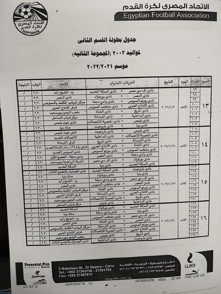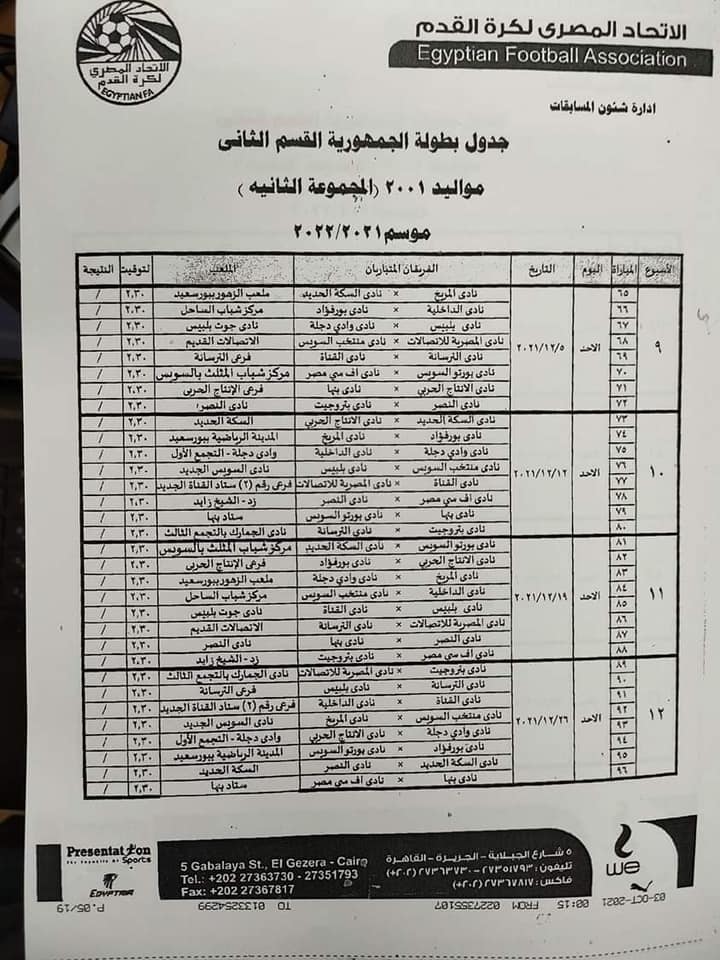 أعلن اتحاد الكرة، عن جدول مباريات دوري الجمهورية لأندية دوري القسم الثاني، المجموعة الثانية لفرق القاهرة والقناة، موسم 2021 -2022.