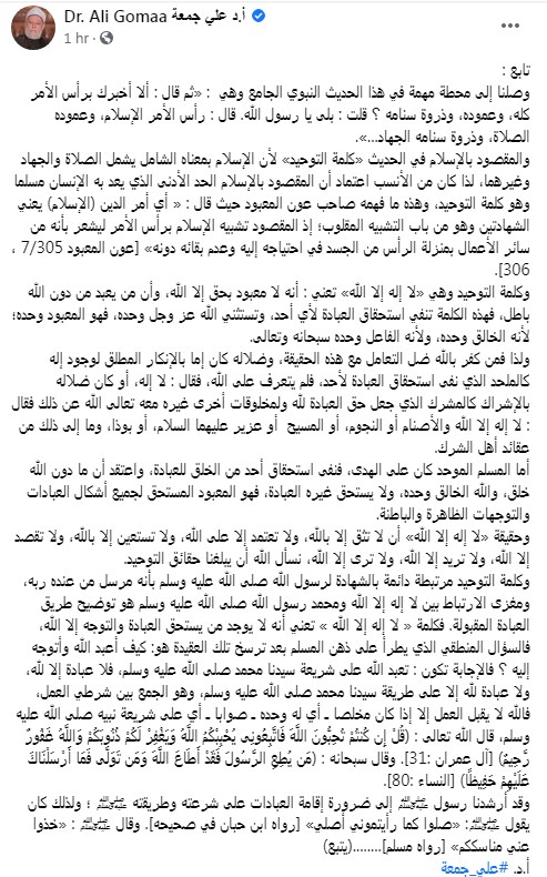 وكتب الدكتور علي جمعة تدوينة على الفيس بوك "وصلنا إلى محطة مهمة في هذا الحديث النبوي الجامع وهي: «ثم قال: ألا أخبرك برأس الأمر كله، وعموده، وذروة سنامه؟ قلت: بلى يا رسول الله. قال: رأس الأمر الإسلام، وعموده الصلاة، وذروة سنامه الجهاد...».