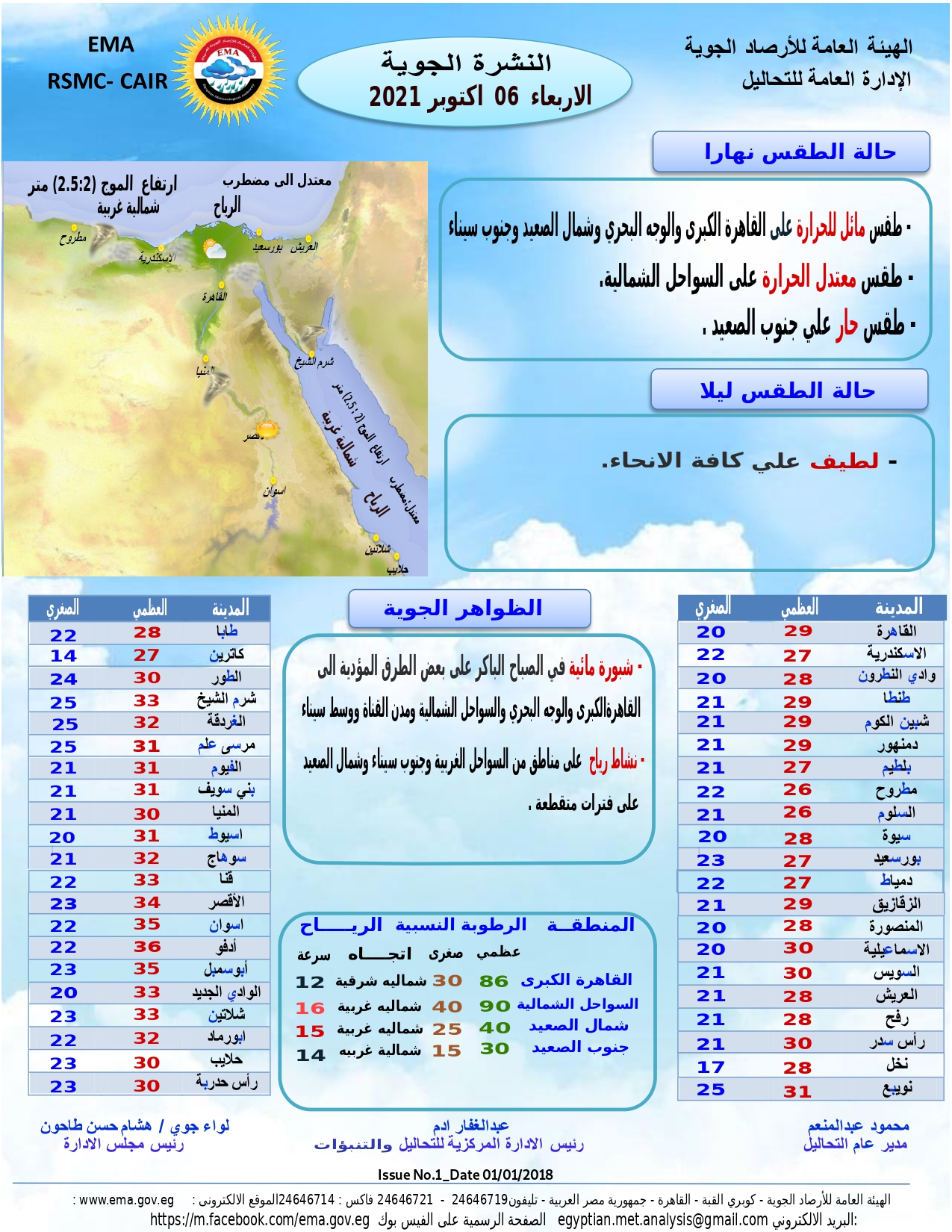 أعلنت هيئة الأرصاد الجوية حالة الطقس، اليوم الأربعاء 6 أكتوبر 2021، وتوقعت أن يسود طقس مائل للحرارة على القاهرة الكبرى والوجه البحري وشمال الصعيد وجنوب سيناء نهارًا، معتدل الحرارة على السواحل الشمالية، وحار على جنوب الصعيد لفترات النهار.