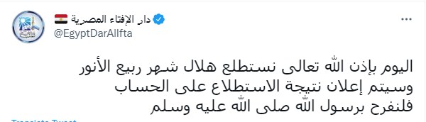 وكتبت دار الإفتاء تغريدة على تويتر "اليوم بإذن الله تعالى نستطلع هلال شهر ربيع الأنور وسيتم إعلان نتيجة الاستطلاع على الحساب فلنفرح برسول الله صلى الله عليه وسلم"