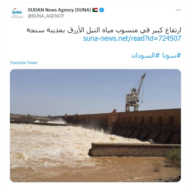 أكد وكالة الأنباء السودانية "سونا"، عبر حسابها الرسمية بموقع التواصل الاجتماعي "تويتر"، إرتفاع منسوب مياه النيل الأزرق ارتفاعًا كبيرًا، مؤكدة أن منسوب مياه النيل الأزرق سجل، صباح اليوم الأربعاء، 16،40 مترًا بزيادة مترًا و5 سنتيمترات عن منسوب أمس الثلاثاء.