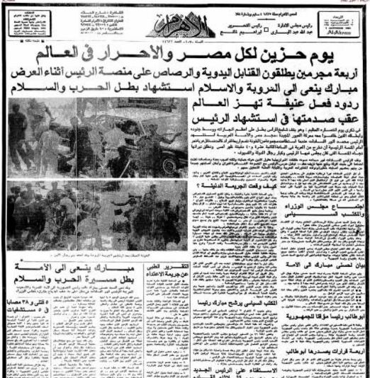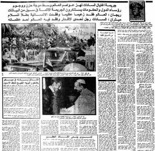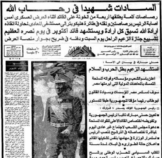 فى عدد الأهرام بتاريخ 7 أكتوبر 1981 جاء مانشيت الأهرام ليسكن فوق الترويسة (السادات شهيدًا فى رحاب الله)، وتم وضع المانشيت أعلى الترويسة فى خمسة سطور، واستكمل الأهرام الصفحة الأولى ببقية العناوين وبيان من نائب رئيس الجمهورية حسنى مبارك ومقال لرئيس تحرير الأهرام إبراهيم نافع.