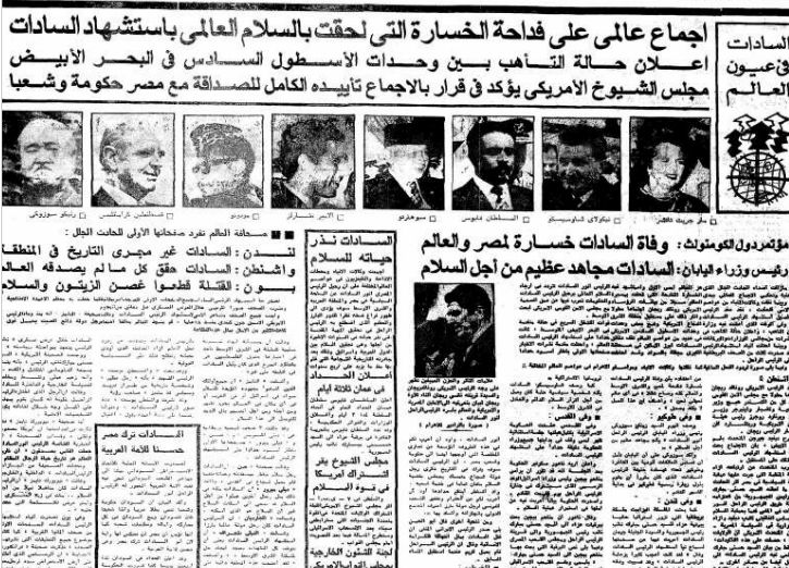 وفى اليوم التالى 8 أكتوبر، فى إطار متابعة اغتيال الرئيس السادات وبمانشيت فوق الترويسة حول ترشيح رئيس مجلس الشعب لرئاسة الجمهورية، وفى 9 أكتوبر استمر المانشيت فى مكانه حول استعدادات مصر لمراسم تشييع جنازة الرئيس السادات، وفى 10 أكتوبر كان مانشيت الأهرام (يوم الوداع الحزين)، وواصل مانشيت الأهرام تمسكه بمكانه فوق الترويسة.