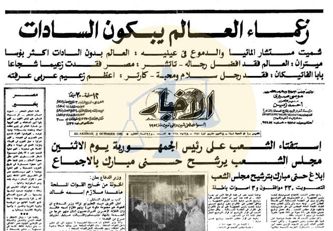 أما أرشيف صحيفة «الأخبار» لشهري أكتوبر ونوفمبر من عام 1981 يوثق للأيام التالية على اغتيال الرئيس الراحل أنور السادات والدفع بنائبه آنذاك حسني مبارك، الرئيس الأسبق، في استفتاء اعتبر وقتها أن الشعب خرج بـ«الإجماع وبتأييد شعبي مطلق».