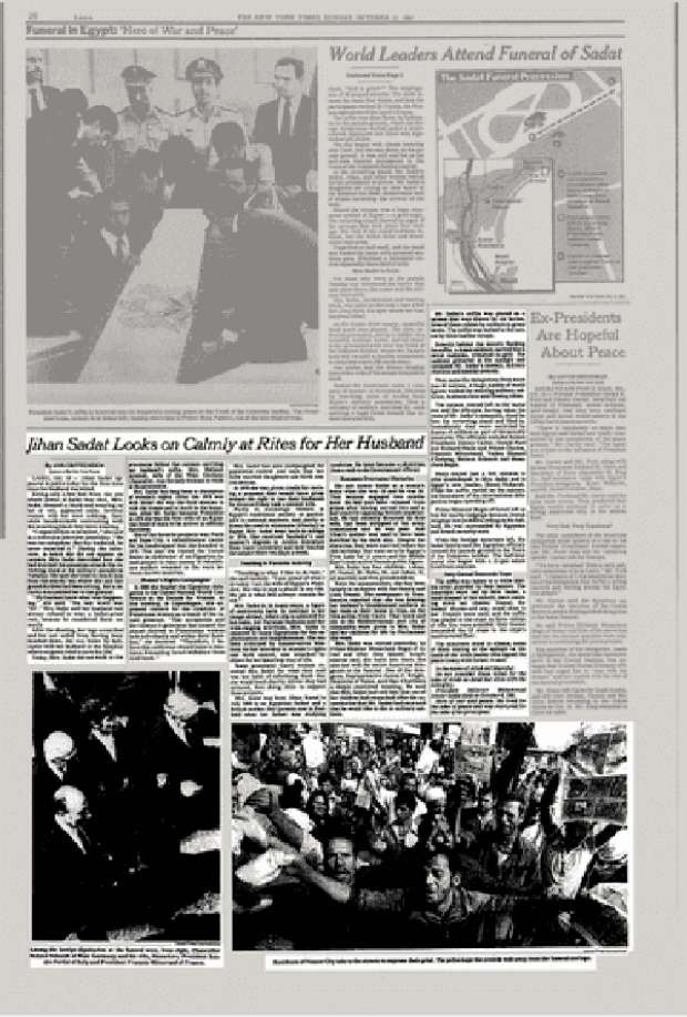 وعن مقتل السادات، كتبت جريدة سان فرانسيسكو كرونيكل الأمريكية موضوعا أرفقته برسم توضيحي يوضح طريقة اغتيال الرئيس الراحل على المنصة.