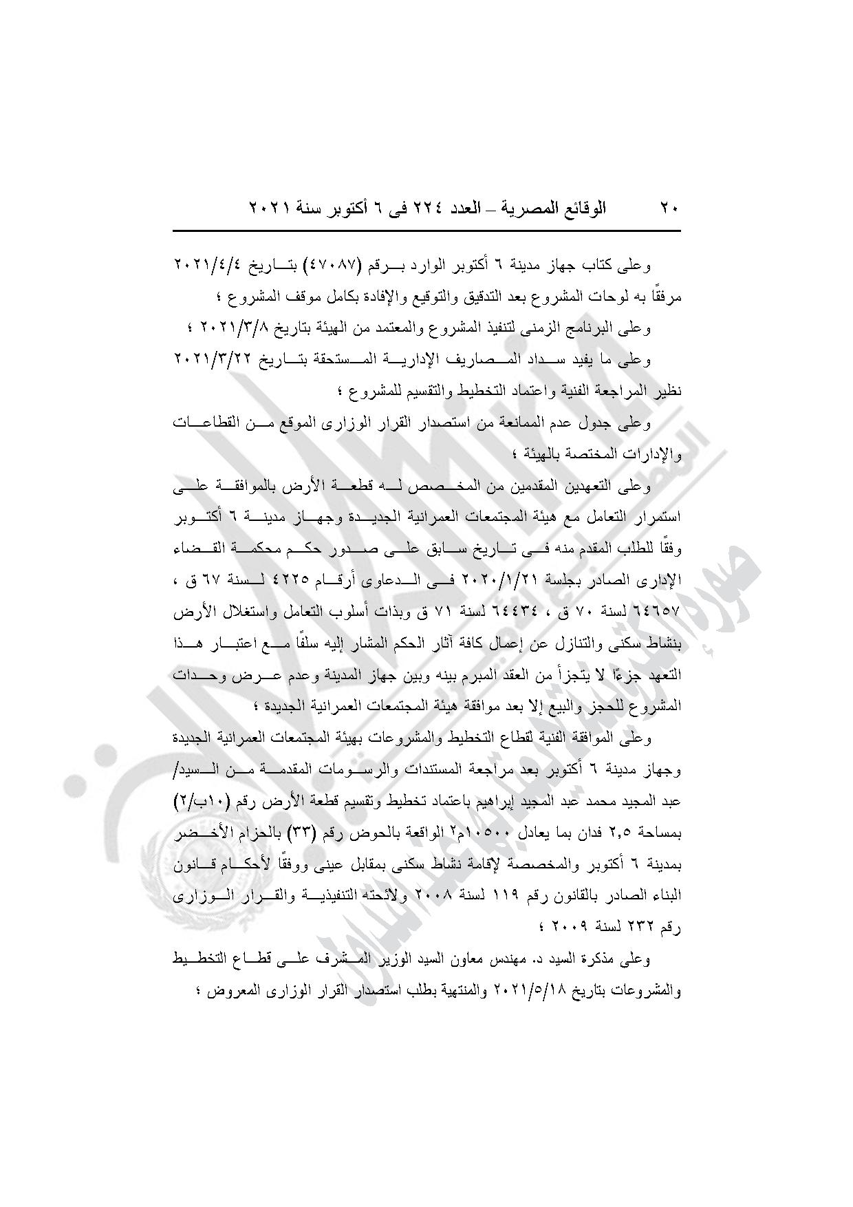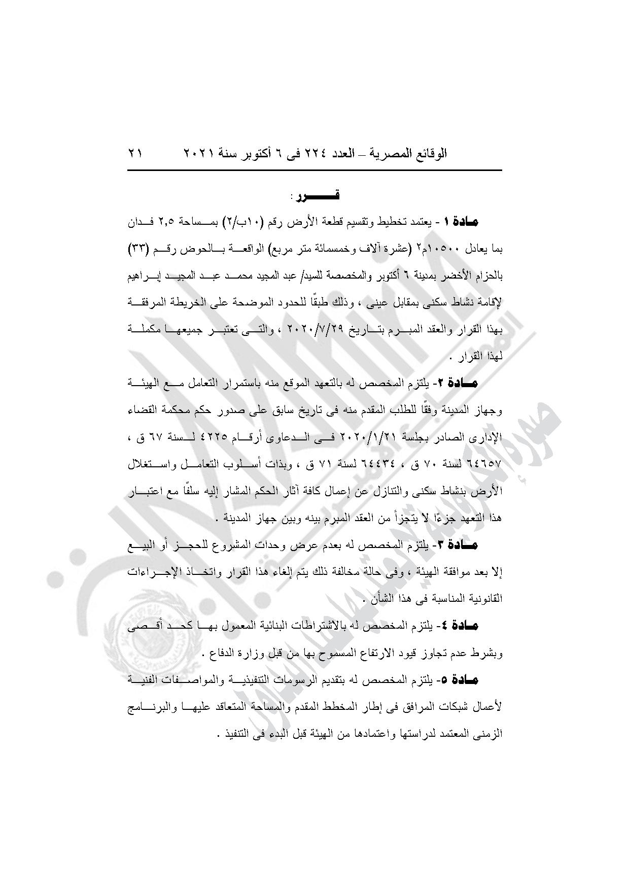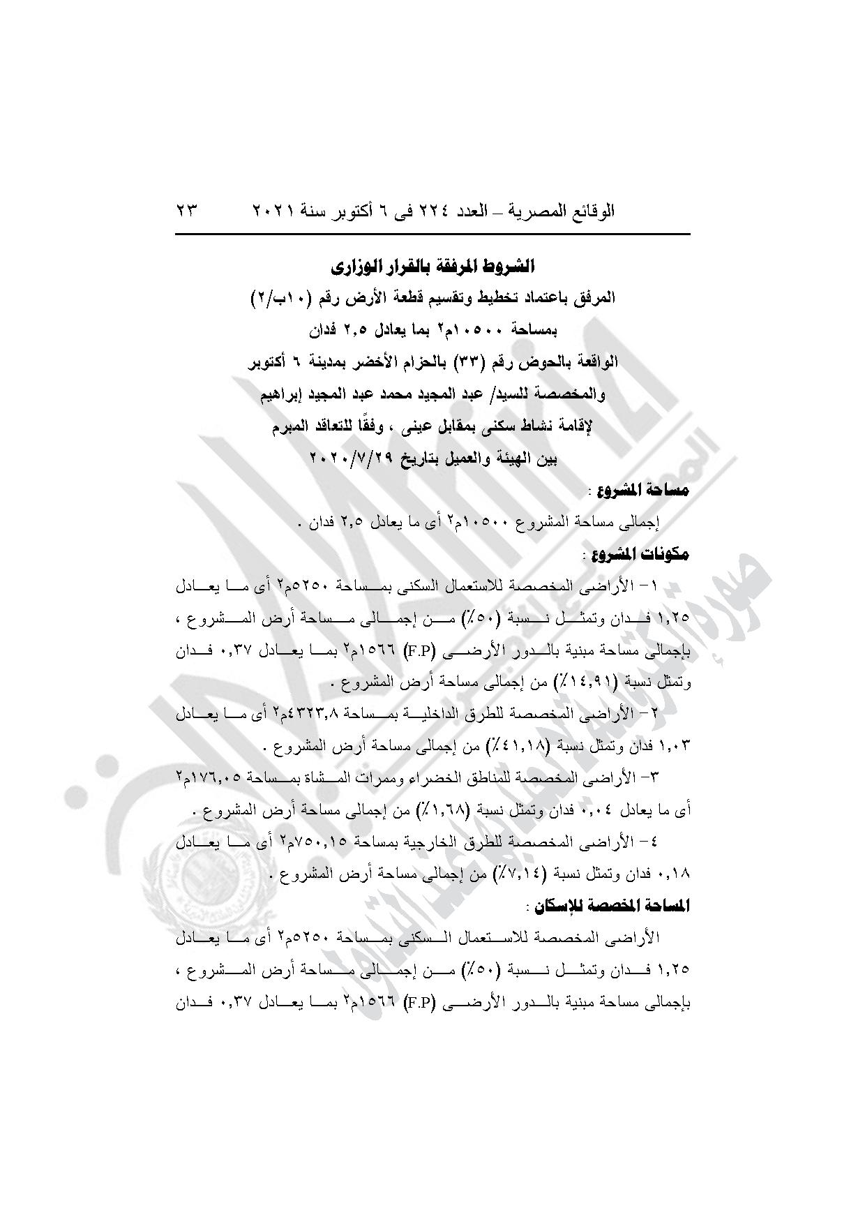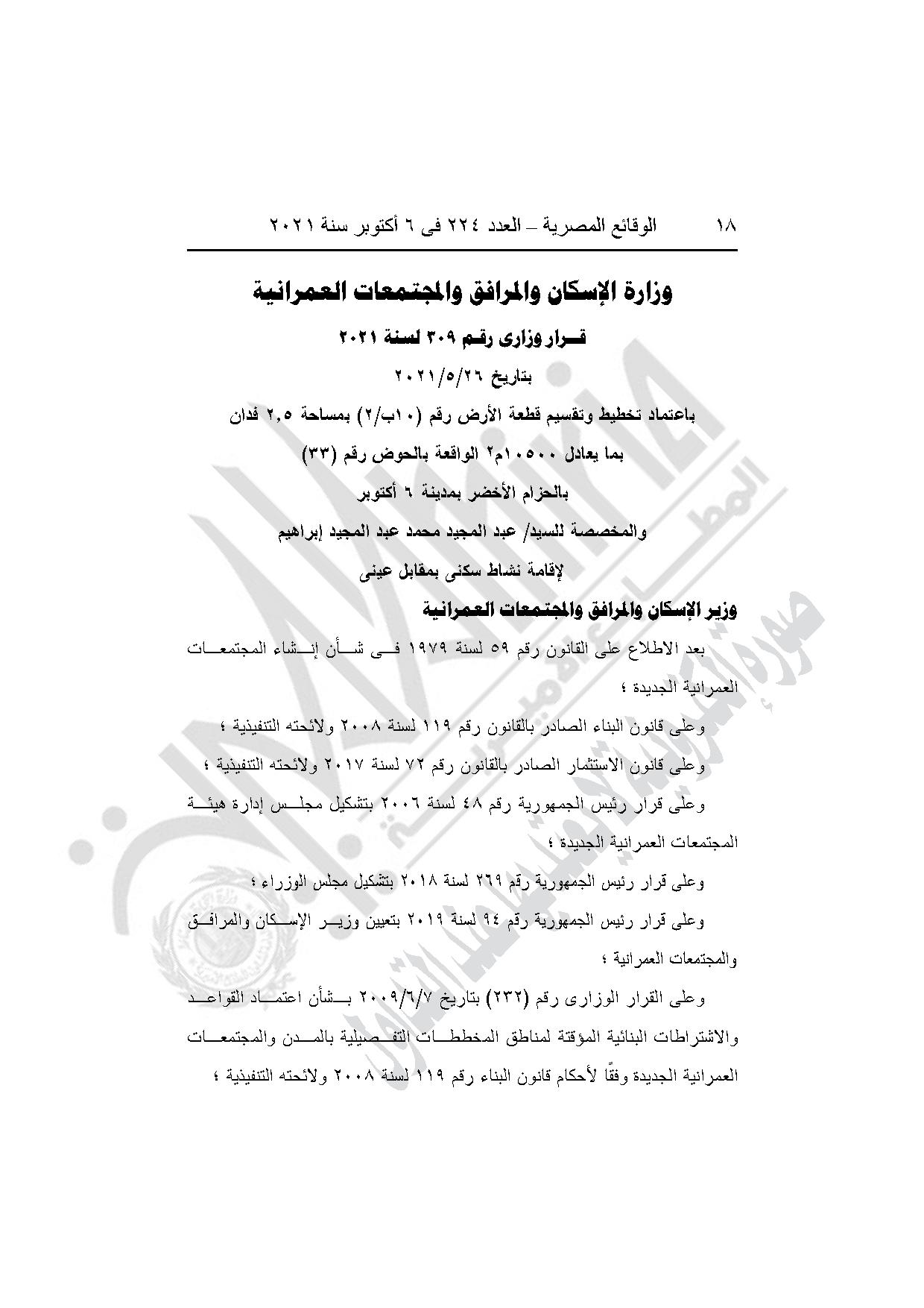 وحمل القرار الثاني رقم 309 لسنة 2021، باعتماد تخطيط وتقسيم قطعة الأرض رقم (10ب/2) بمساحة 2.5 فدان بما يعادل 10500 متر مربع الواقعة بالحوض رقم (33) بالحزام الأخضر بمدينة 6 أكتوبر، والمخصصة لـ عبد المجيد محمد عبد المجيد إبراهيم لإقامة نشاط سكني بمقابل عيني.