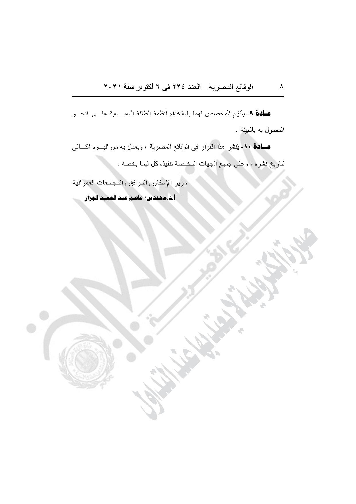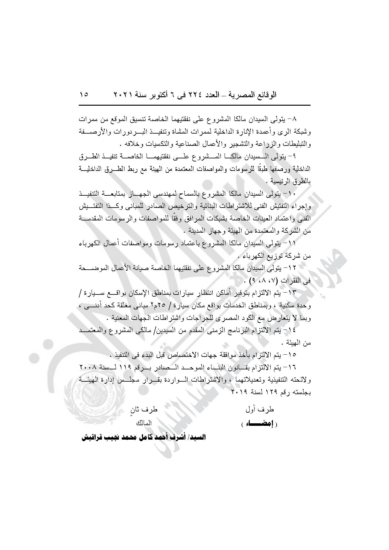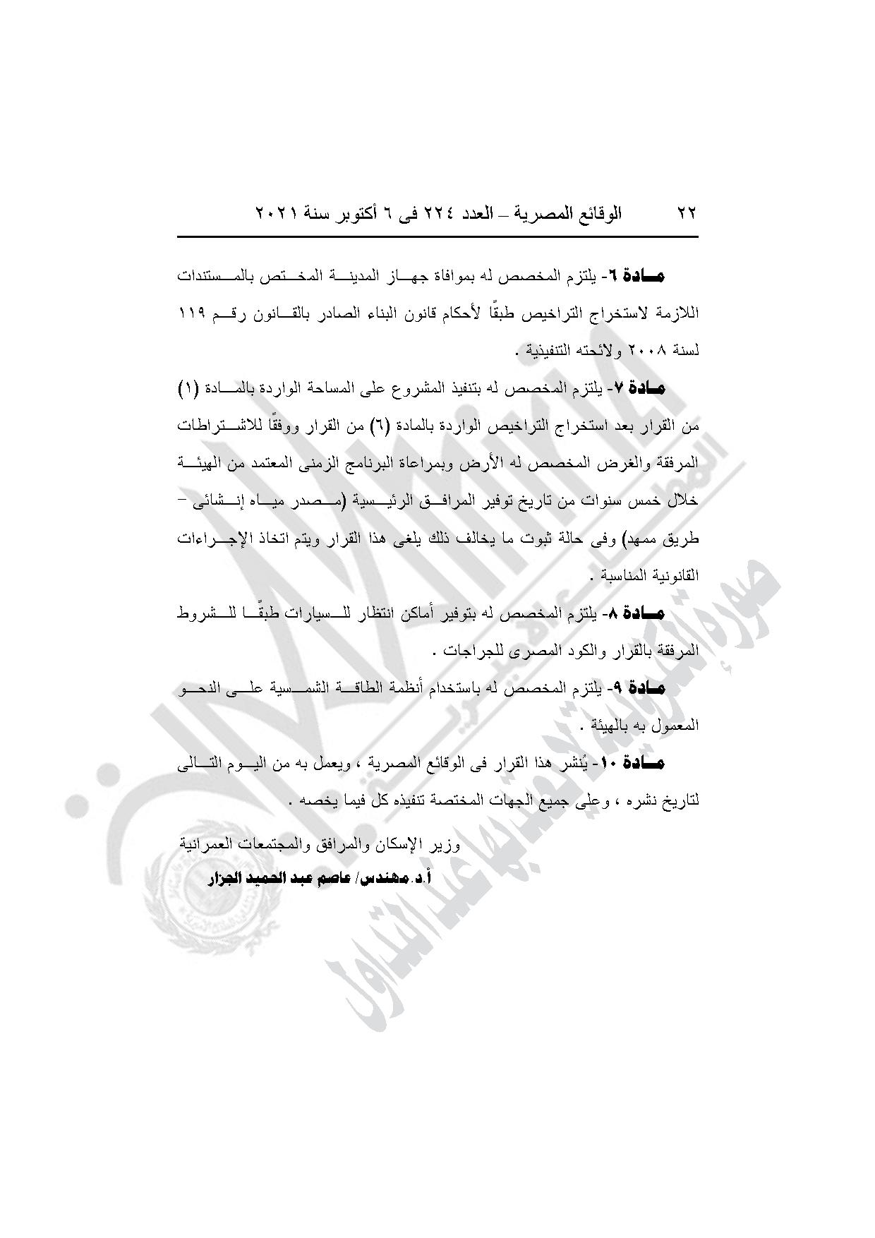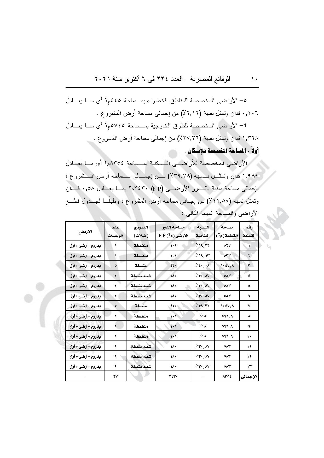 وحمل القرار الثاني رقم 309 لسنة 2021، باعتماد تخطيط وتقسيم قطعة الأرض رقم (10ب/2) بمساحة 2.5 فدان بما يعادل 10500 متر مربع الواقعة بالحوض رقم (33) بالحزام الأخضر بمدينة 6 أكتوبر، والمخصصة لـ عبد المجيد محمد عبد المجيد إبراهيم لإقامة نشاط سكني بمقابل عيني.