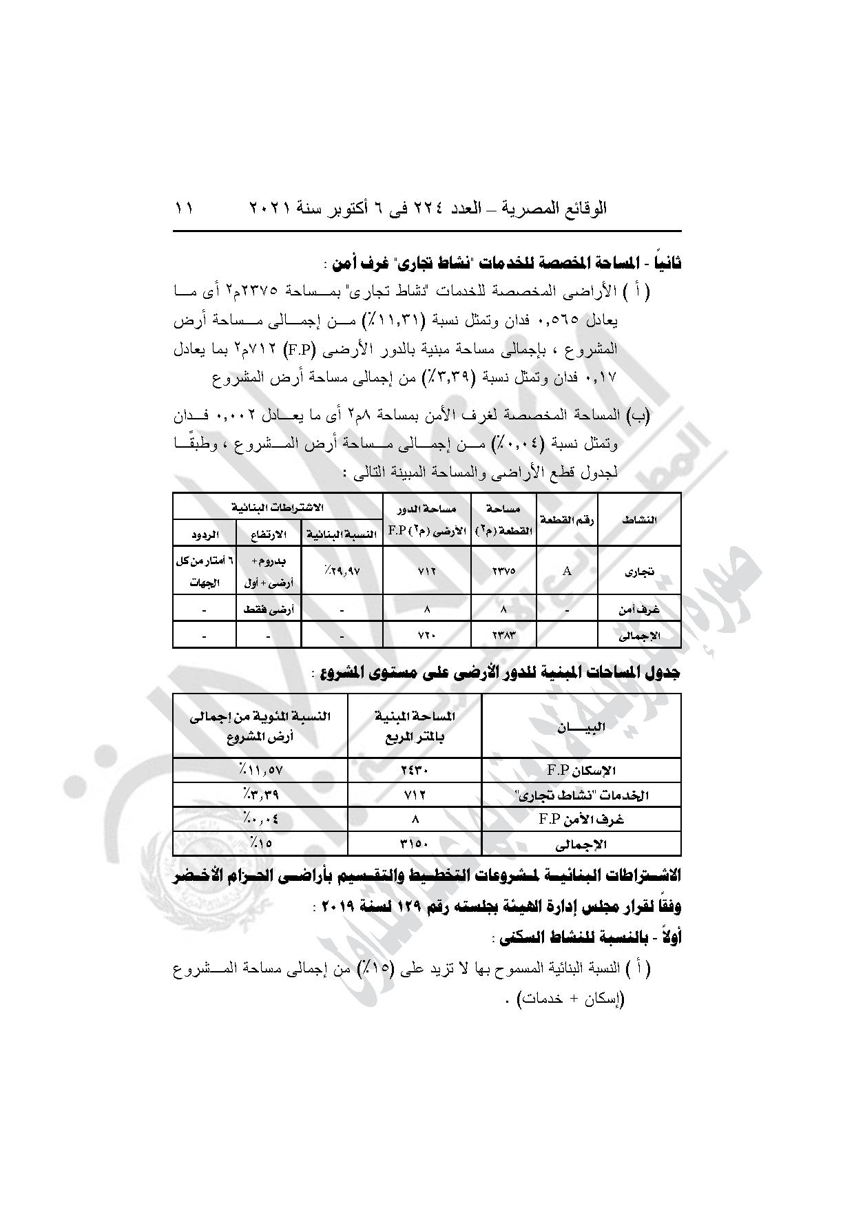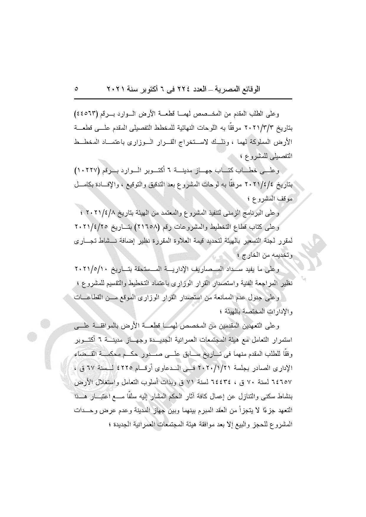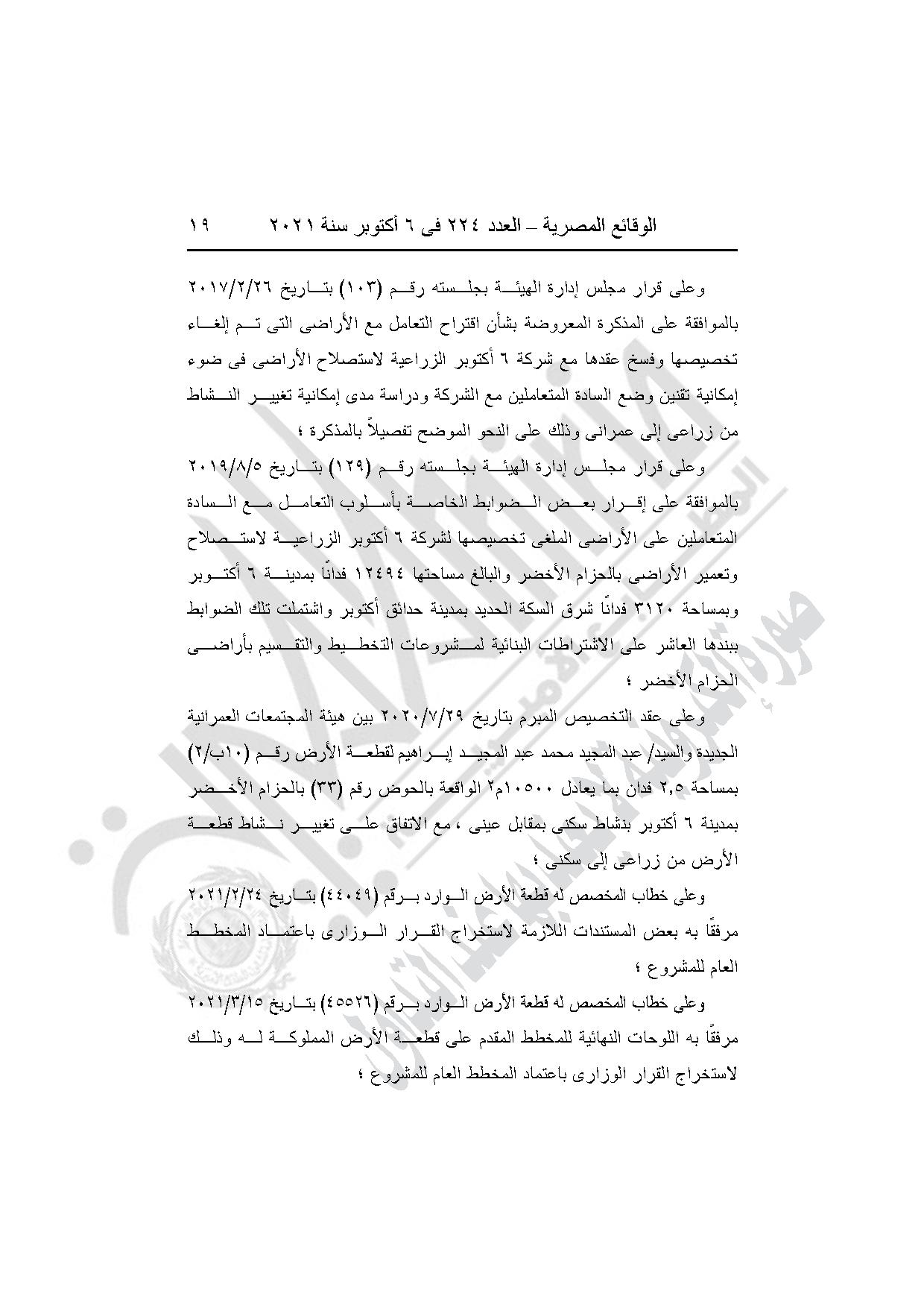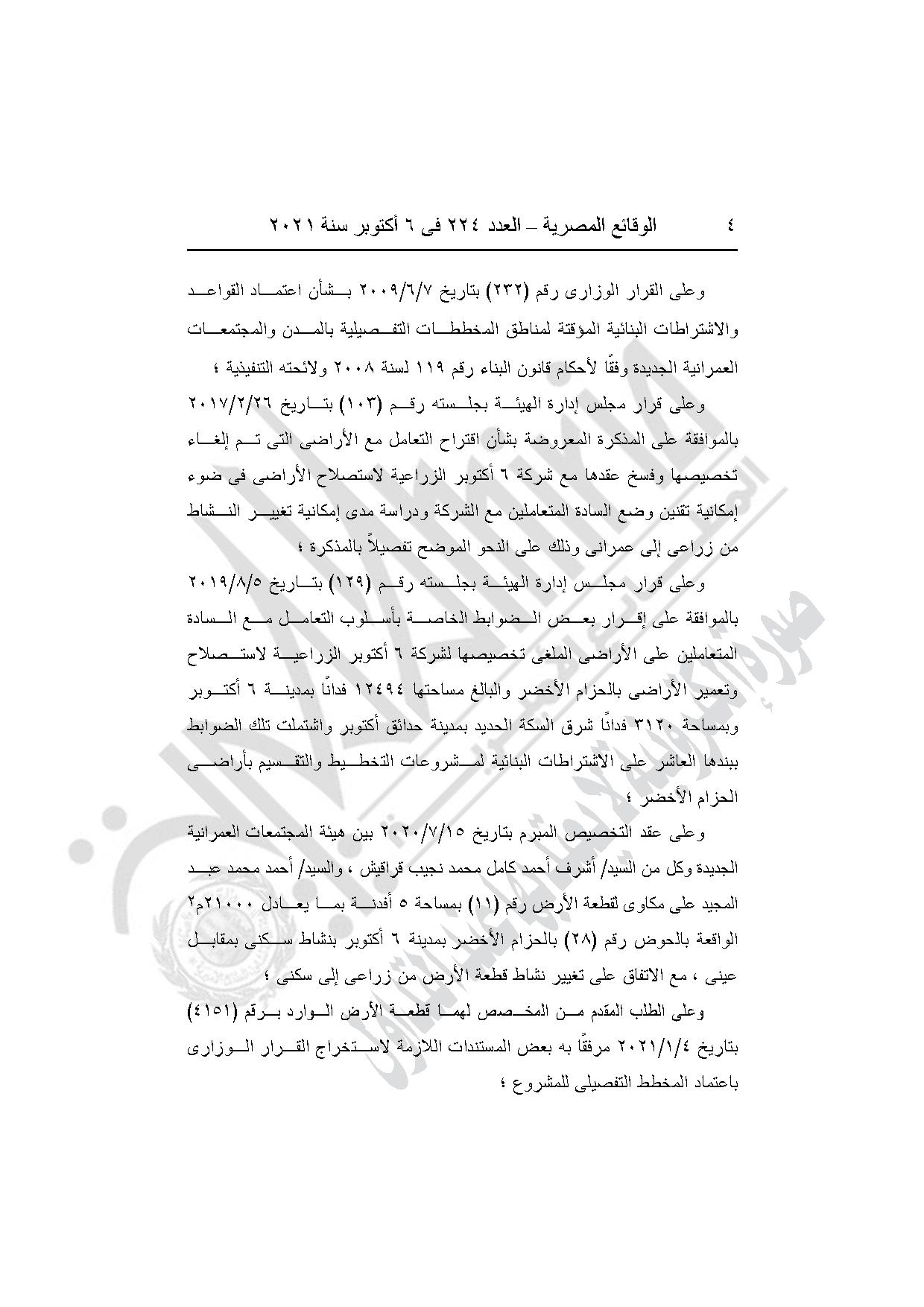 نشرت جريدة الوقائع المصرية في عددها رقم 224، الصادر في 6 أكتوبر 2021، قراري وزارة الإسكان والمرافق والمجتمعات العمرانية، بشأن اعتماد تخطيط وتقسيم قطعتي أرض في الحزام الأخضر بمدينة السادس من أكتوبر، لإقامة نشاط سكني بمقابل عيني.
