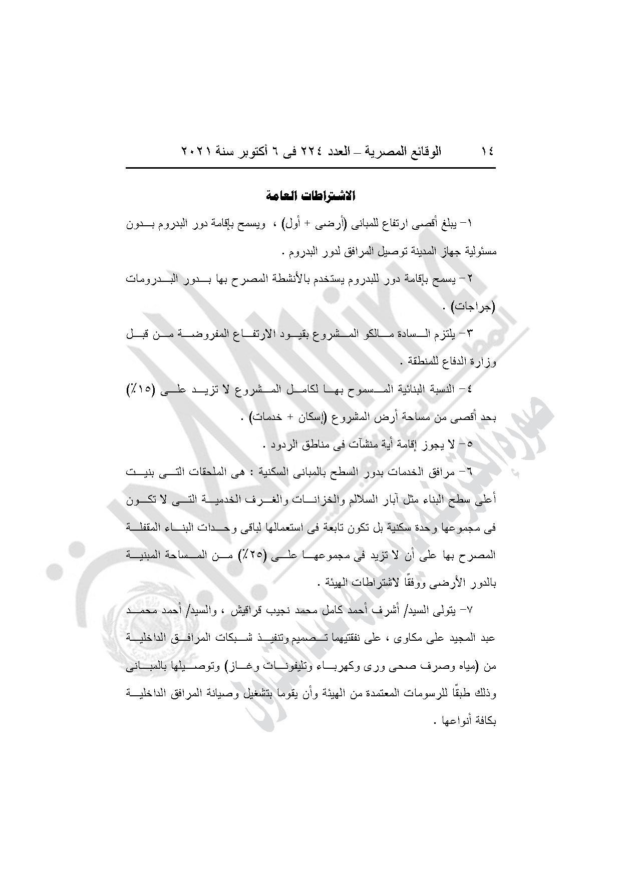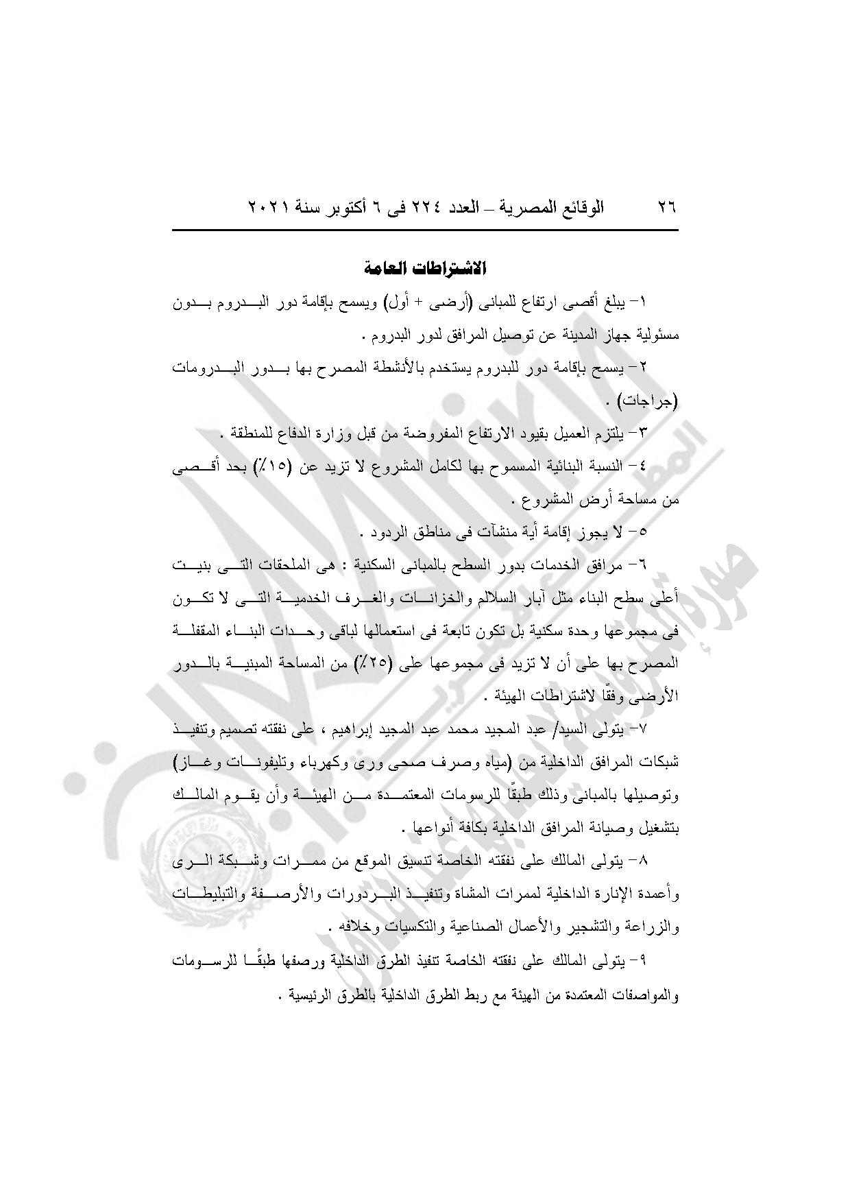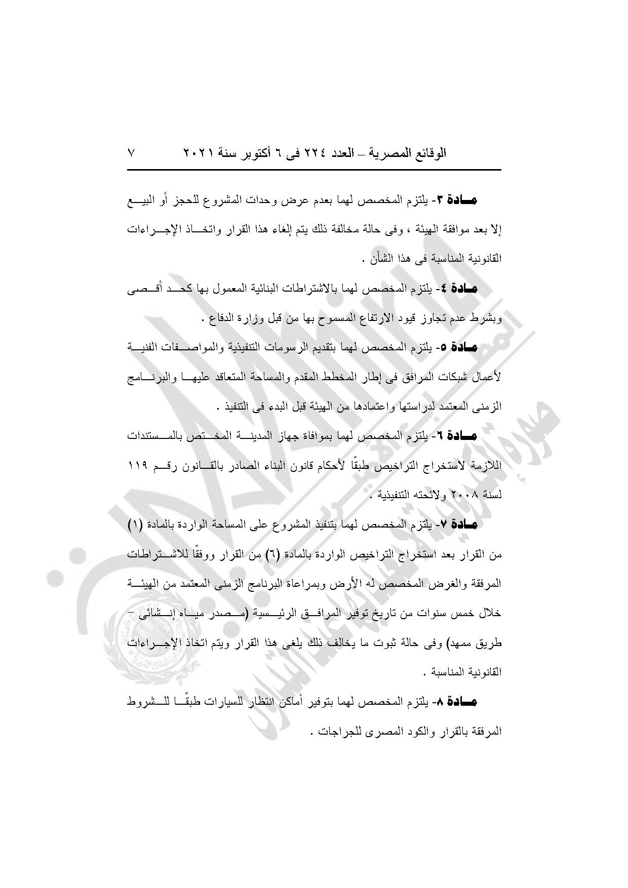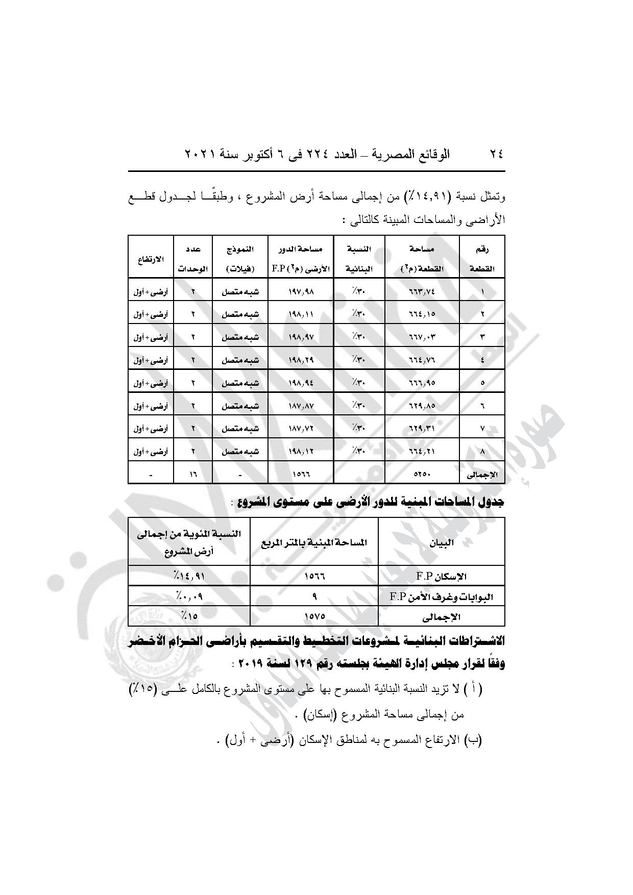 نشرت جريدة الوقائع المصرية في عددها رقم 224، الصادر في 6 أكتوبر 2021، قراري وزارة الإسكان والمرافق والمجتمعات العمرانية، بشأن اعتماد تخطيط وتقسيم قطعتي أرض في الحزام الأخضر بمدينة السادس من أكتوبر، لإقامة نشاط سكني بمقابل عيني.