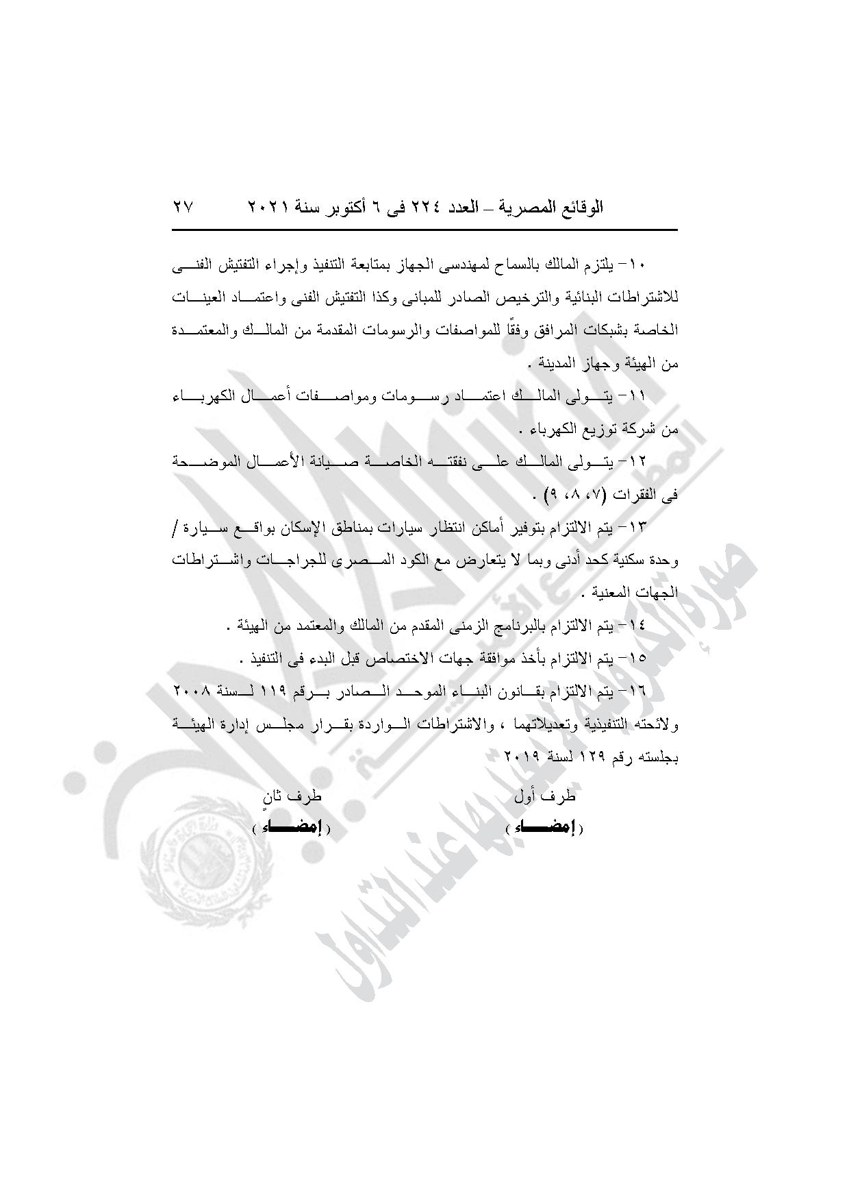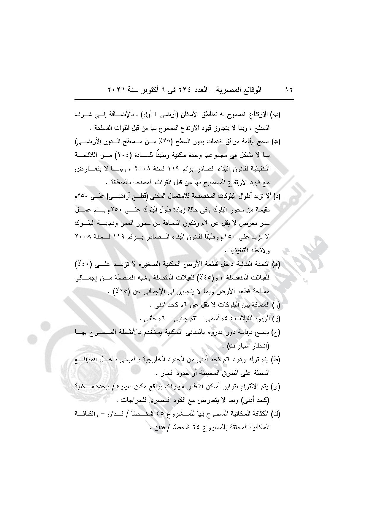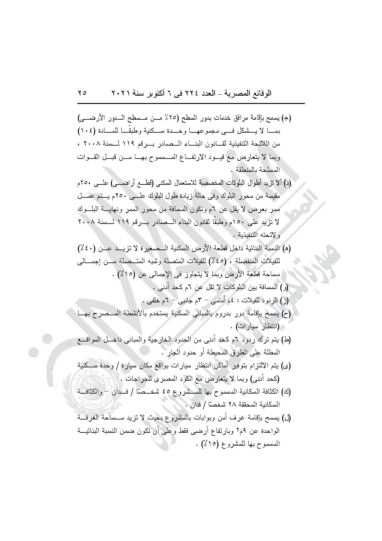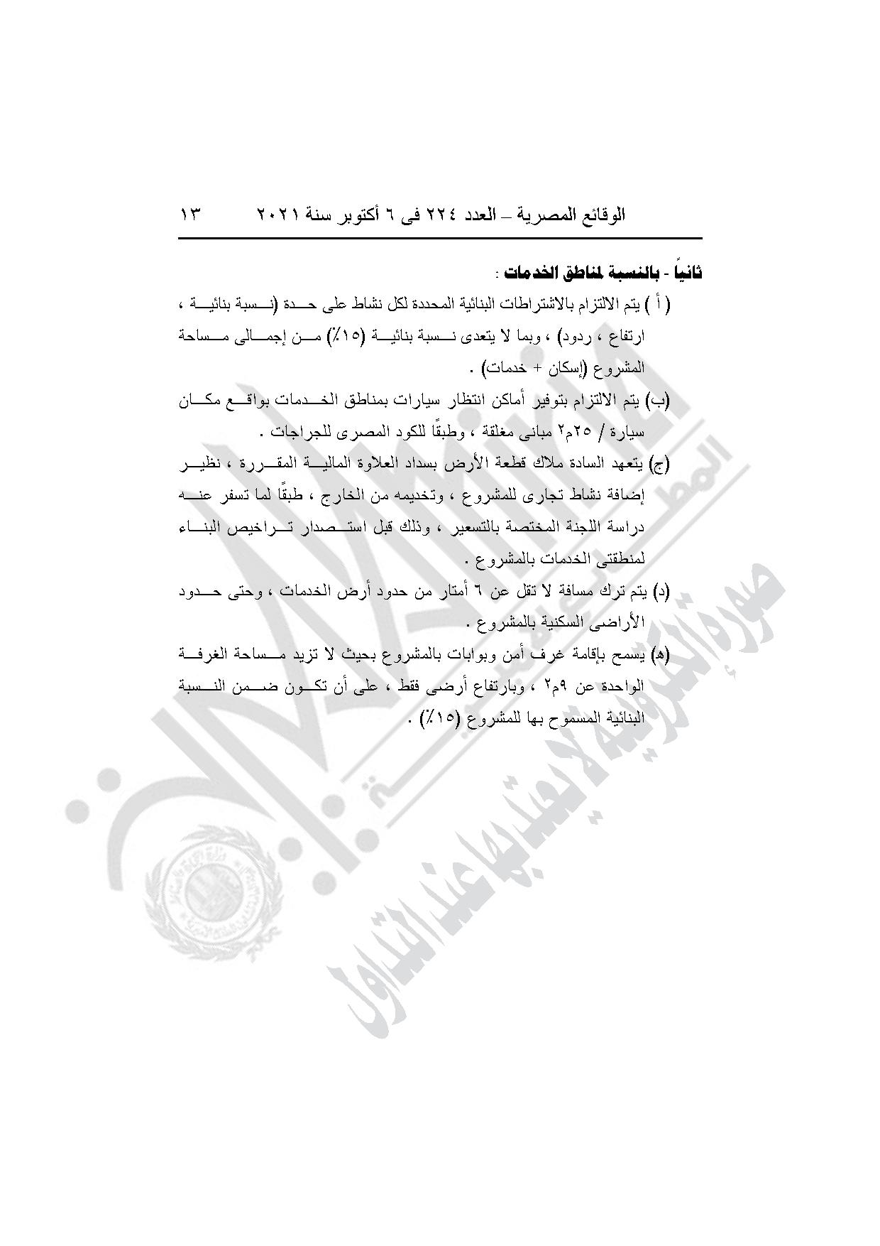 نشرت جريدة الوقائع المصرية في عددها رقم 224، الصادر في 6 أكتوبر 2021، قراري وزارة الإسكان والمرافق والمجتمعات العمرانية، بشأن اعتماد تخطيط وتقسيم قطعتي أرض في الحزام الأخضر بمدينة السادس من أكتوبر، لإقامة نشاط سكني بمقابل عيني.