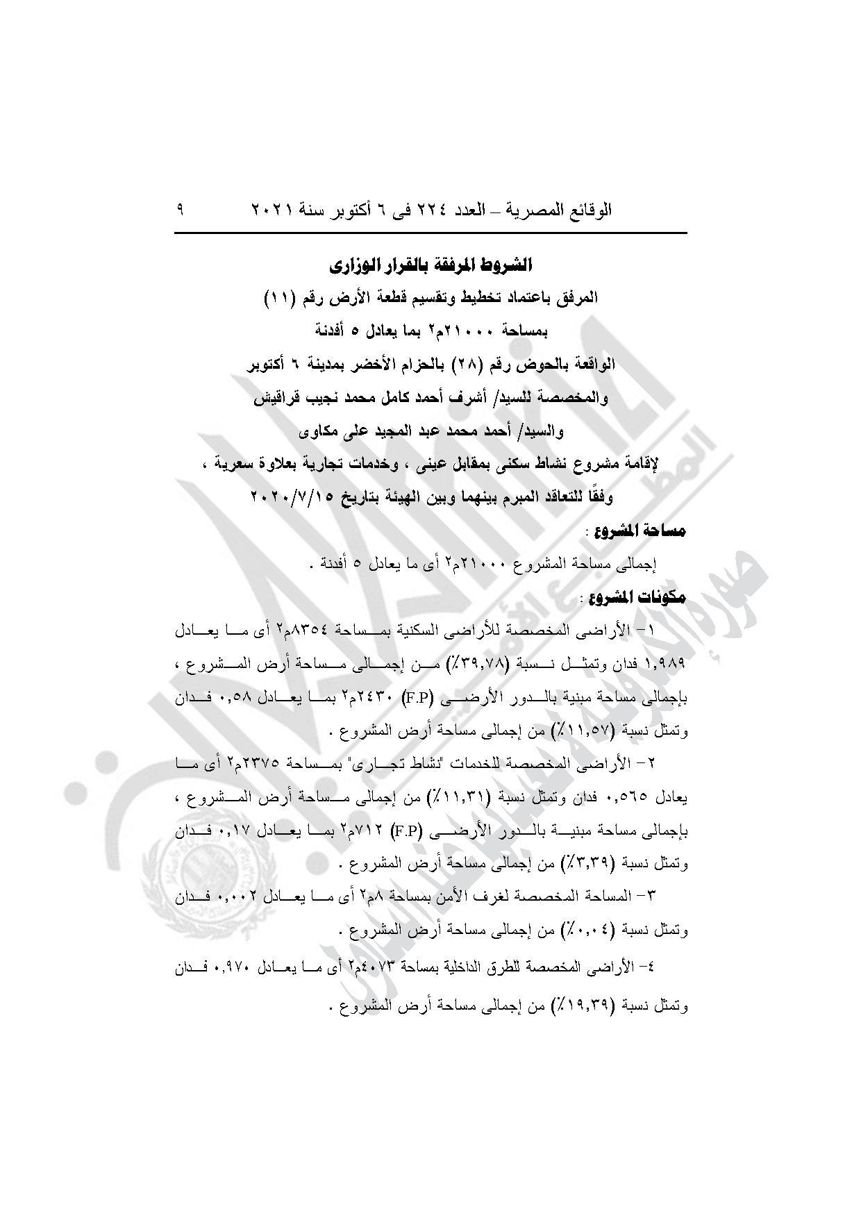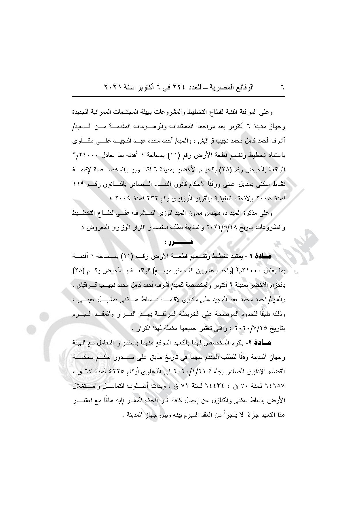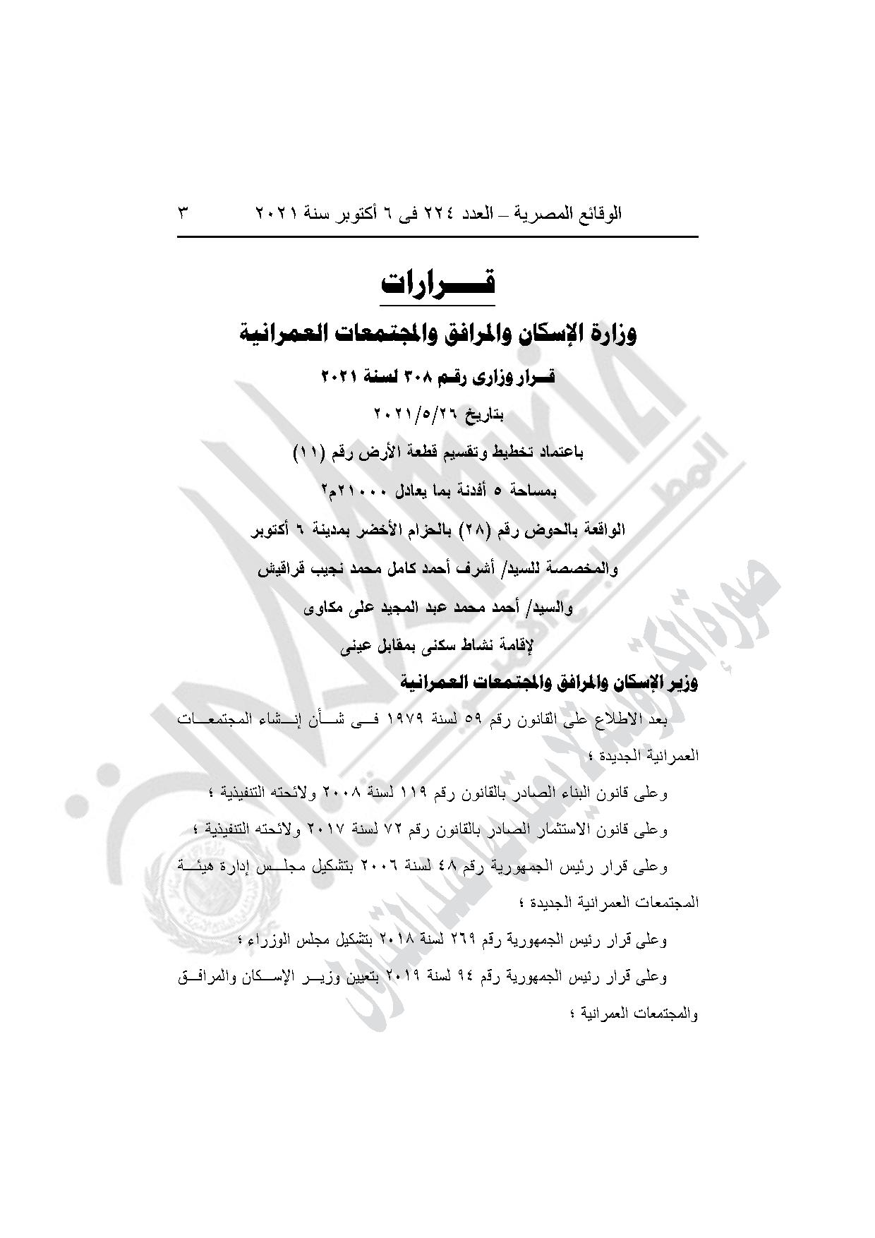 وحمل القرار الأول رقم 308 لسنة 2021، بشأن باعتماد تخطيط وتقسيم قطعة الأرض رقم (11) بمساحة 5 أفدنة بما يعادل 21000 متر مربع الواقعة بالحوض رقم (28) بالحزام الأخضر بمدينة 6 أكتوبر والمخصصة لـ أشرف أحمد كامل محمد نجيب قراقيش وأحمد محمد عبد المجيد علي مكاوي لإقامة نشاط سكني بمقابل عيني.
