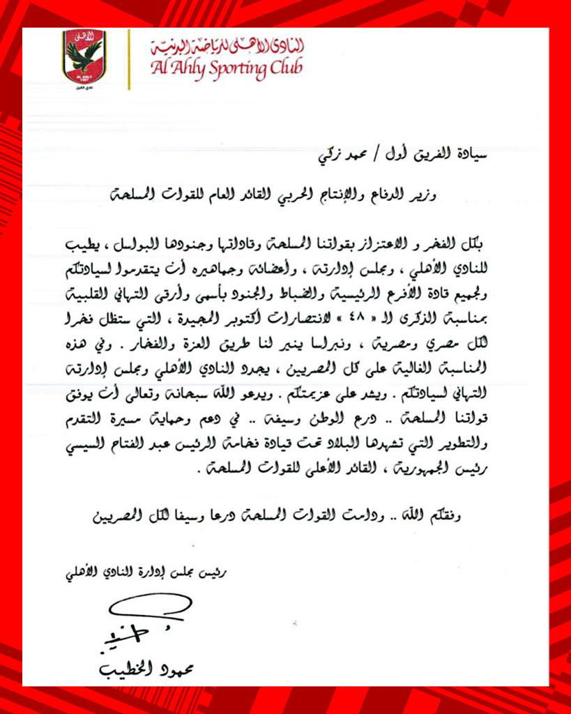 كما حرص مجلس إدارة النادي الأهلي برئاسة الكابتن محمود الخطيب، على تقديم التهنئة إلى الرئيس عبدالفتاح السيسي القائد الأعلى للقوات المسلحة؛ بمناسبة الذكرى الـ48 لانتصارات أكتوبر المجيدة، وجاءت التهنئة كالتالي: