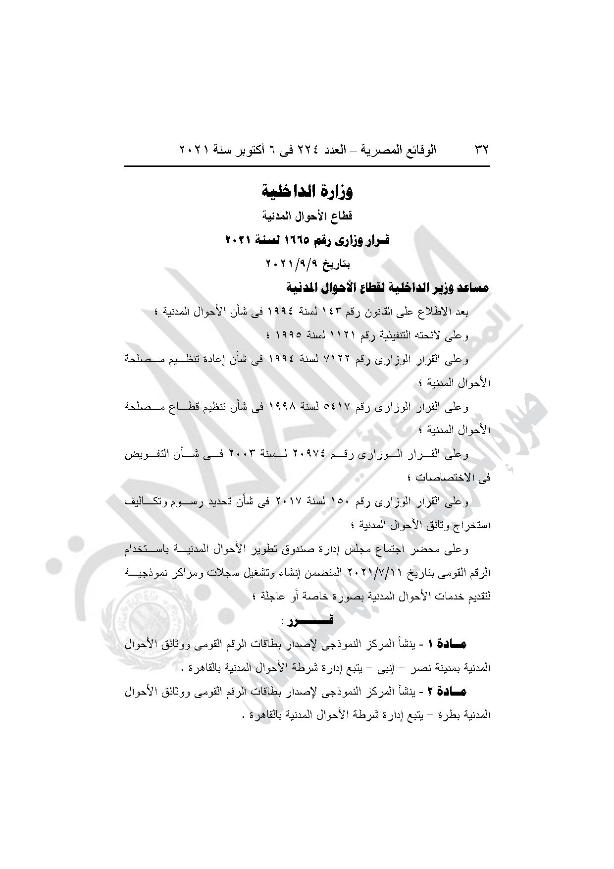 نشرت جريدة الوقائع المصرية في عددها رقم 224، الصادر في 6 أكتوبر 2021، قرارى وزارة الداخلية برد الجنسية المصرية لـ10 أشخاص، وإنشاء 25 مركز مركز نموذجي لإصدار بطاقات الرقم القومى ووثائق الأحوال يتبع إدارة شرطة الأحوال المدنية بمختلف المحافظات.