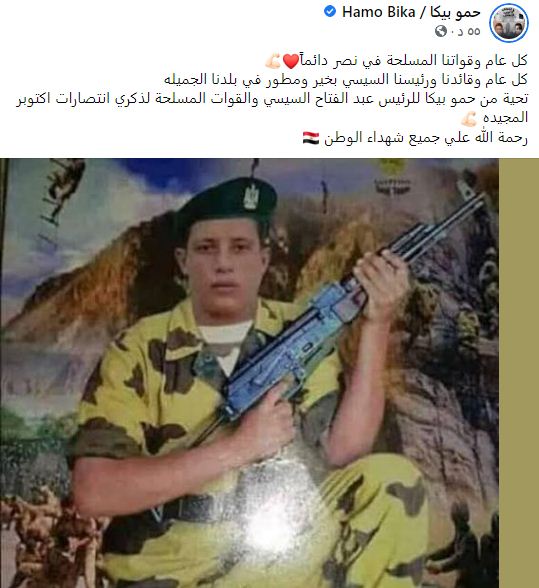 ونشر حمو بيكا صورة له مرتديا الزي العسكري، عبر حسابه الشخصي بموقع التواصل الاجتماعي فيس بوك، وكتب: كل عام وقواتنا المسلحة في نصر دائما، كل عام وقائدنا ورئيسنا السيسي بخير ومطور في بلدنا الجميلة، تحية من حمو بيكا للرئيس عبد الفتاح السيسي والقوات المسلحة لذكرى انتصارات أكتوبر المجيدة، رحمة الله على جميع شهداء الوطن.
