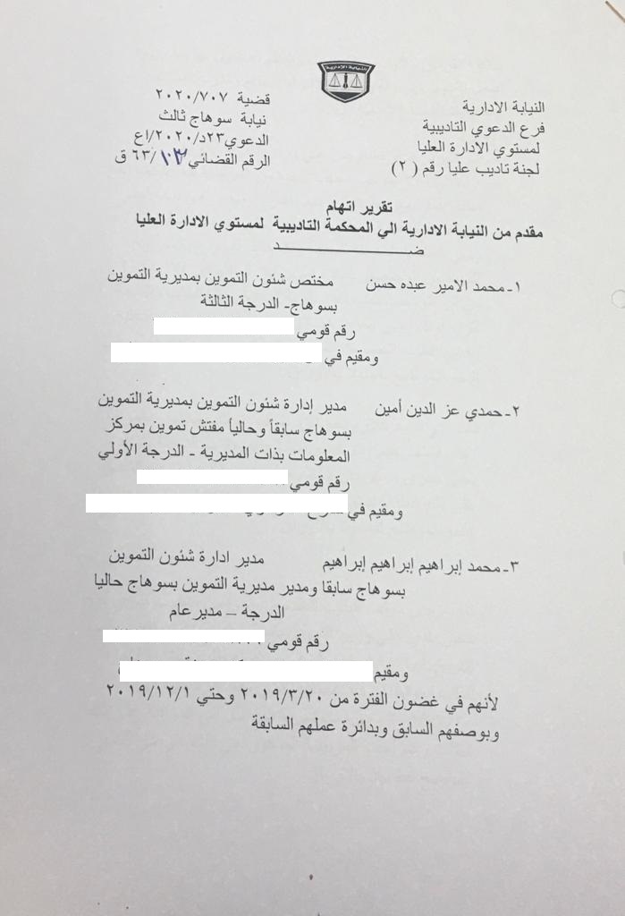 وأكد تقرير الإتهام أن المحالون الثلاثة خلال الفترة من 20 مارس 2019 حتى أول ديسمبر من نفس العام، وبدائرة عملهم خالفوا القوانين واللوائح والقرارات والنظم المعمول بها ولم يؤدوا العمل المنوط بهم بدقة وخالفوا الإلتزام بأحكام ومدونات السلوك وأخلاقيات الخدمة المدنية.