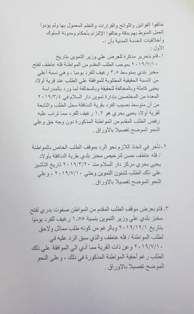 وقام المحال بعرض موقف طلب مواطن آخر لفتح مخبز بلدي على وزير التموين بنسبة 1.55 رغيف للفرد يوميًا في أول ديسمبر 2019 رغم كونه طلب مماثل ولاحق لطلب المواطنة الأولى والذي سبق الرد عليه في 10 يوليو 2019 عن ذات القرية مما أدى الى الموافقة على ذلك الطلب رغم أحقية المواطنة صاحبة الطلب الأول.