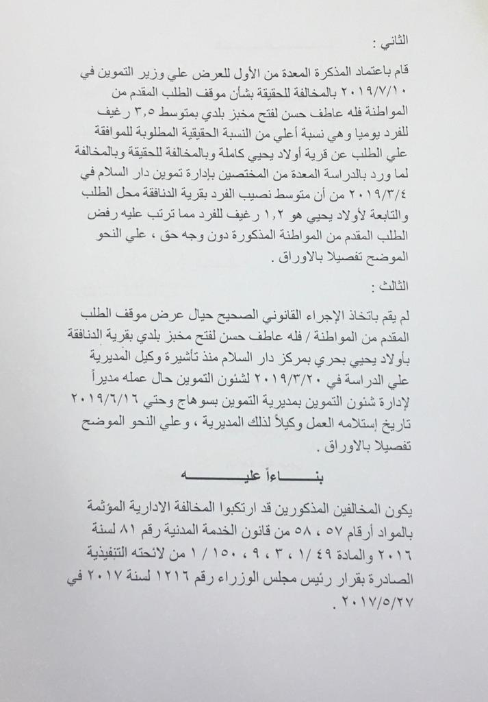 وتضمنت مذكرة النيابة الإدارية أن محمد إبراهيم إبراهيم، مدير إدارة شئون التموين لم يقم باتخاذ الإجراء القانوني الصحيح حيال عرض موقف الطلب الأول المقدم من المواطنة لفتح مخبز بلدي منذ تأشيرة وكيل المديرية على الدراسة في 20 مارس 2019 لشئون التموين، أثناء عمله مديرًا لإدارة شئون التموين بمديرية تموين سوهاج وحتى 16 يونية 2019، تاريخ استلامه العمل وكيلًا للمديرية.